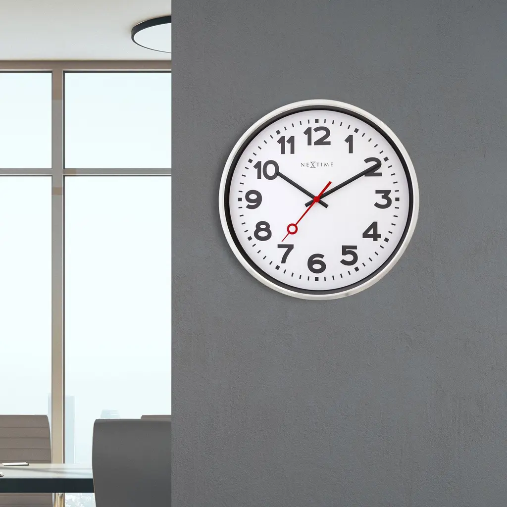 While designed with a bolder aesthetic to stand out on a wall, the NeXtime Station 45 also remains inconspicuous in a room thanks to its completely silent movement. The contemporary design uses strong contrasts and clean shapes to enhance legibility and visual impact. On the white dial, the indexes grab one’s attention with a black finish. Likewise, the two hands can be seen from a distance with ease thanks to their size. A glass cover gives the dial a fresh, modern look. Made with a larger case that measures 45 cm in diameter, this wall clock is perfect for spacious rooms but also suits more compact areas like entryways.