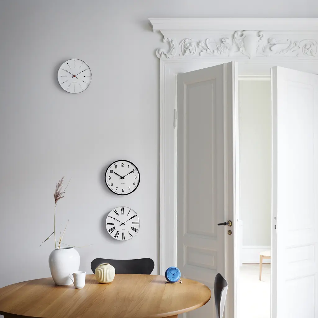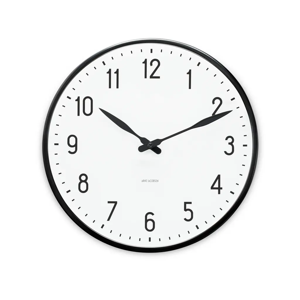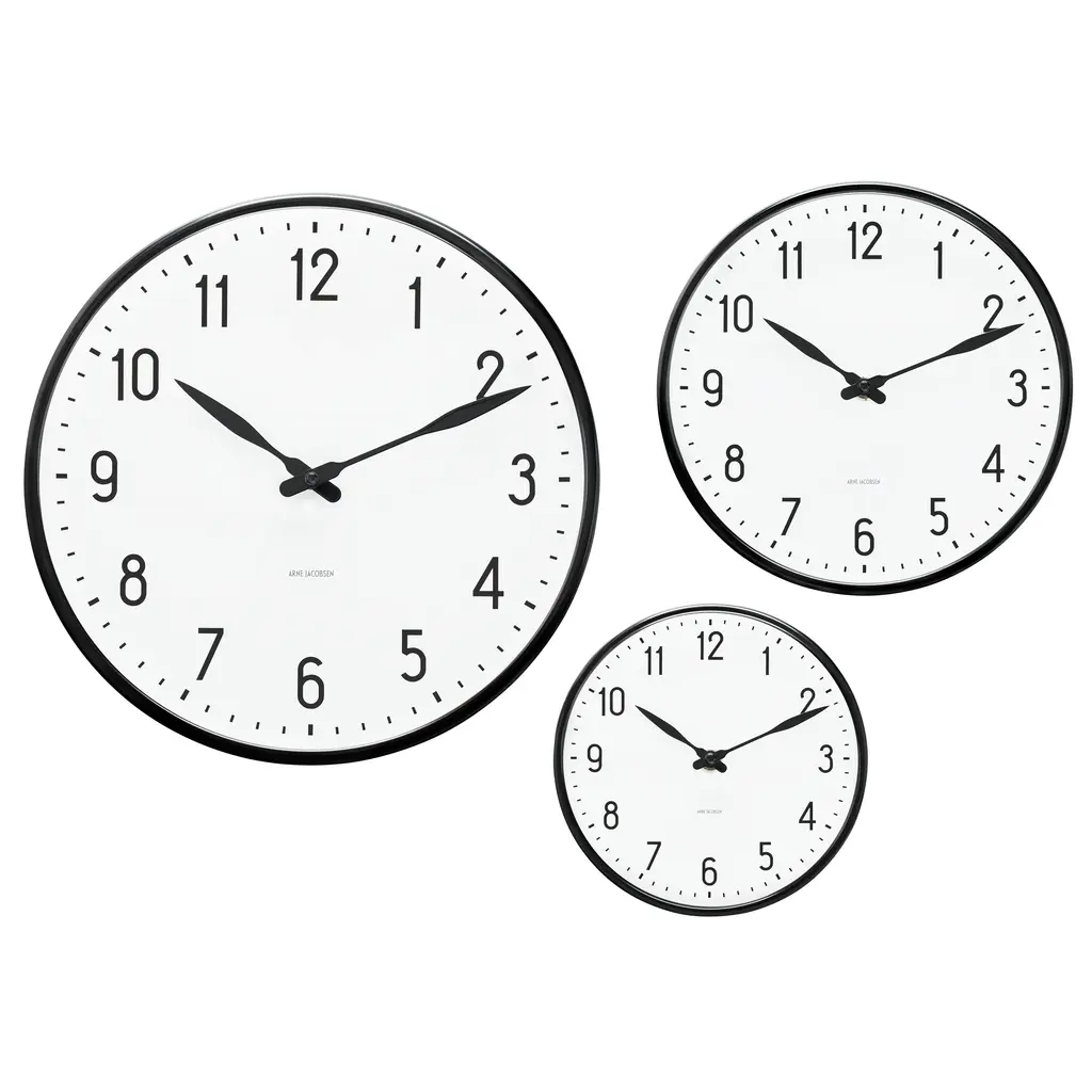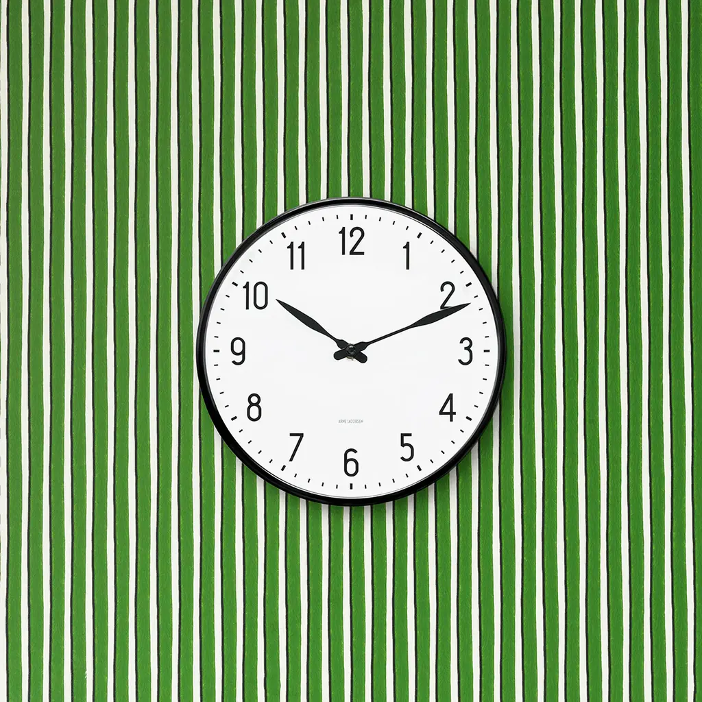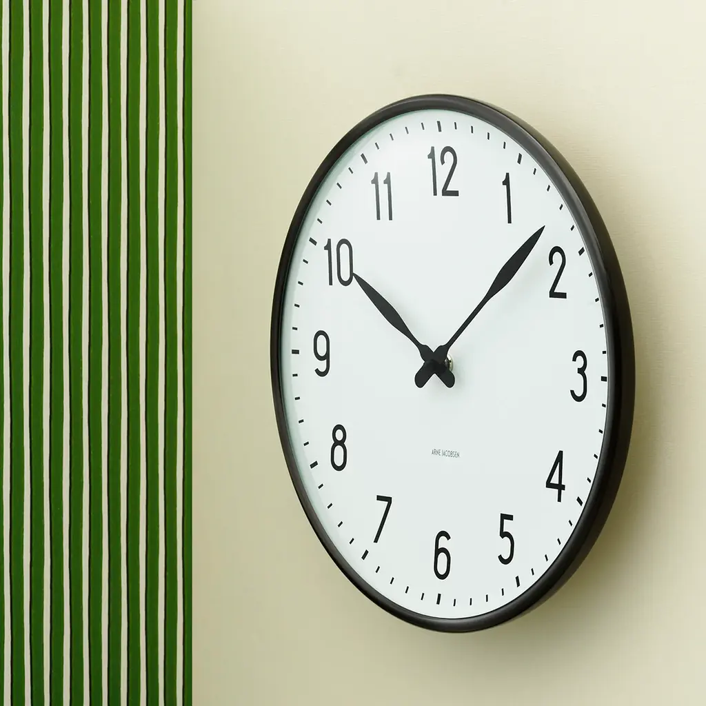 Take time out for the latest interior design trends. Arne Jacobsen's Station Clock was originally designed for the electrical manufacturer LK in 1941. The original design for this iconic classic has now been recreated and transforms an anonymous white wall into a distinctive design statement. The graphic design is emphasised by a top ring in black aluminum. Available in three sizes. A great gift idea that can be handed down through the generations. Features