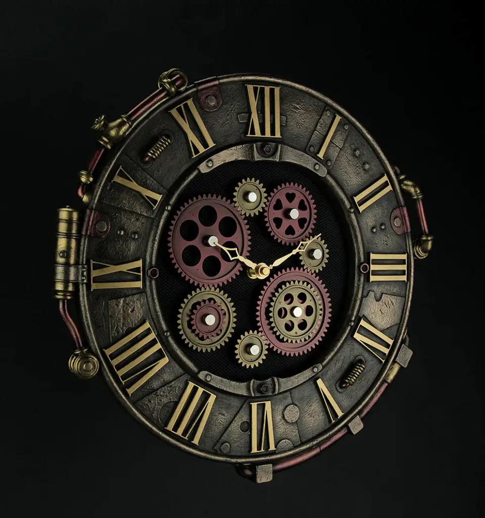 Steampunk Bronze Finish Rivet Plate Wall Clock With Moving Gears