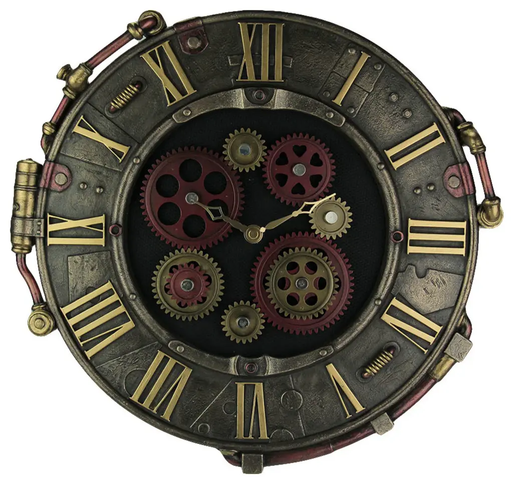 OVERALL SIZE - 14 1/2 Inches High, 14 1/2 Inches Long, 1 Inch WideCrafted in Cold Cast PolyresinHand Painted FinishWonderfully DetailedMakes A Great GiftThis incredibly cool cast resin steampunk-style wall clock adds a Victorian Industrial accent to any room. The wall clock has an antiqued metallic bronze finish, with hand-painted accents to bring out the amazing detail. It measures approximately 14 1/2 inches tall, 14 1/2 inches long, and 1 inch wide, and the quartz clock runs on a single AA battery, while the moving gears on the clock face are powered by 3 more AA batteries (batteries are not included). This wonderful wall clock will make a great gift for any Steampunk enthusiast.