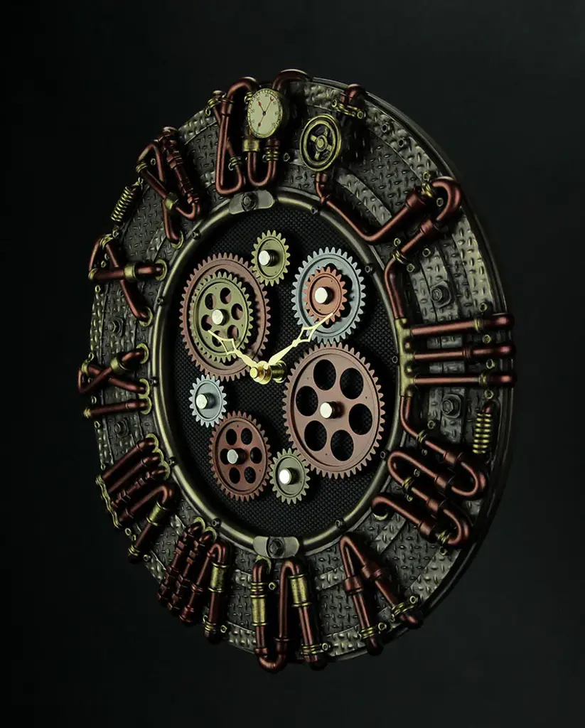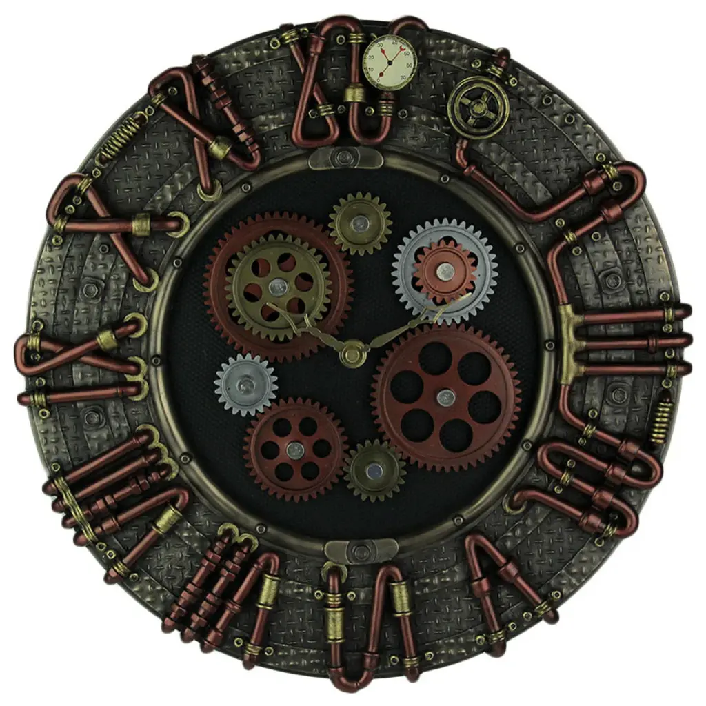 OVERALL SIZE - 13.75 Inches in Diameter, 2 Inches WidePainted with a Metallic Finish for a Vintage LookRequires 1 AA Battery(Not Included) for Clock and 3 AA Batteries(Not Included) for Front Moving GearsRoman Numeral Style Quartz Movement ClockElaborately Designed for the Average Steampunk FanFashioned for an avid fan of the steampunk style this clock represents an elaborate conduit. Made from cast resin the pipes, gears, and metal plating''s are painted with varying colors or red, brown, and brass for a vintage and metal finish. For the roman numerals on the edges of the clock the pipes are shaped out to represent each number. Place in 3 AA batteries(not included) to make the gears on the face of the clock move and 1 AA battery(not included) for the clock to function in quartz movement.