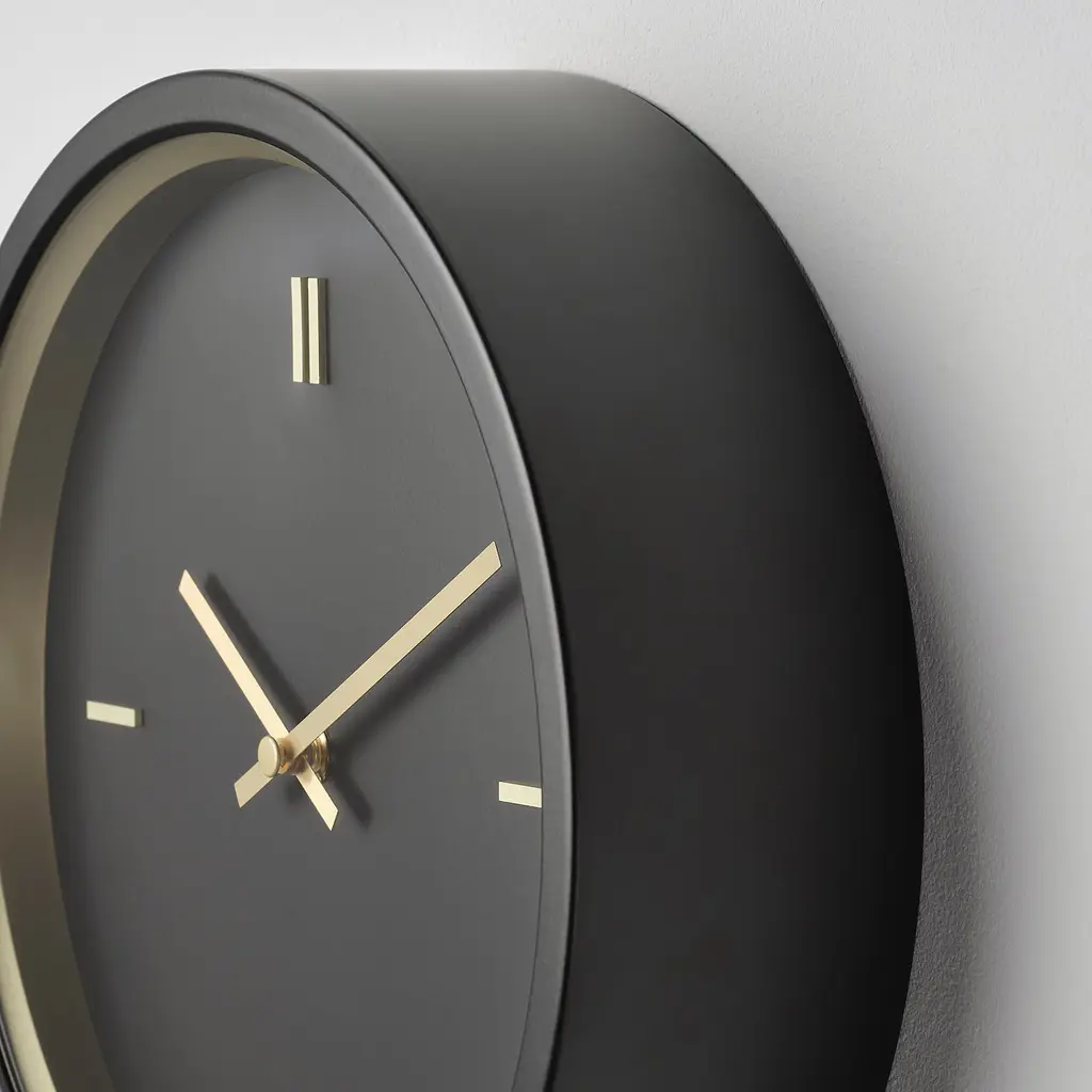 STURSK Wall clock - black 10 ¼ ". Fitted with a quartz movement, it is accurate at keeping time. Batteries are sold separately. IKEA recommends LADDA rechargeable battery. This clock also works with alkaline batteries, 2xAA. This product bears the CE mark.