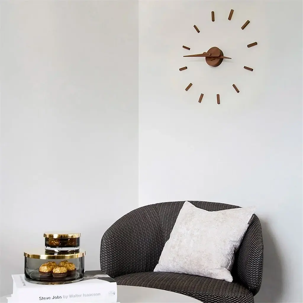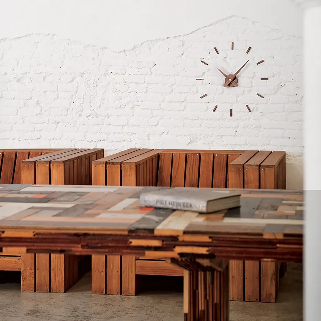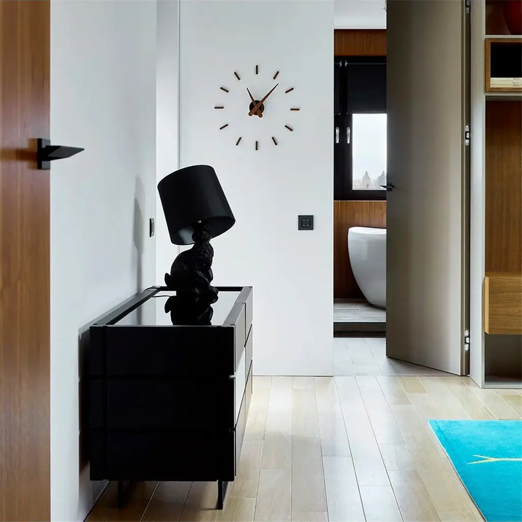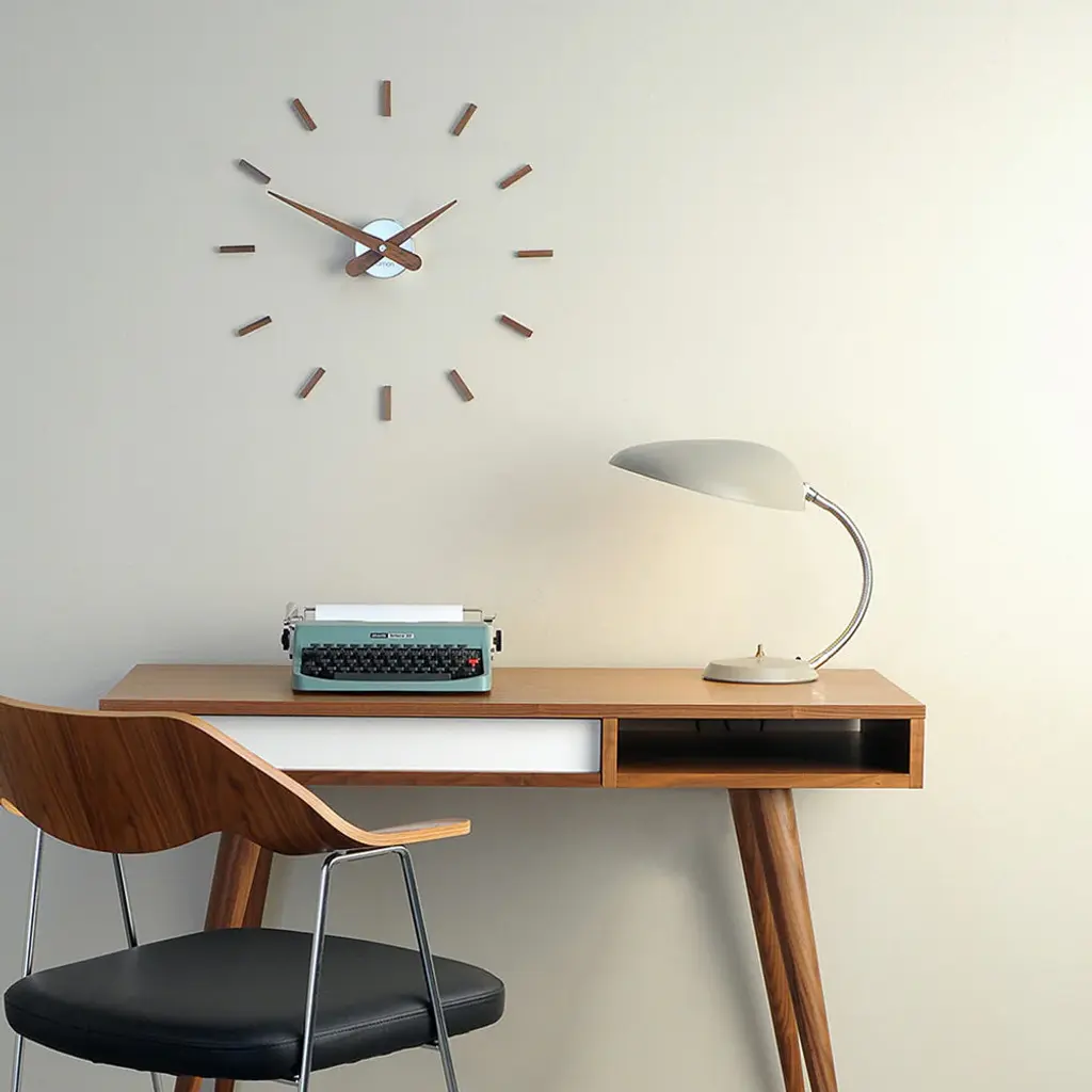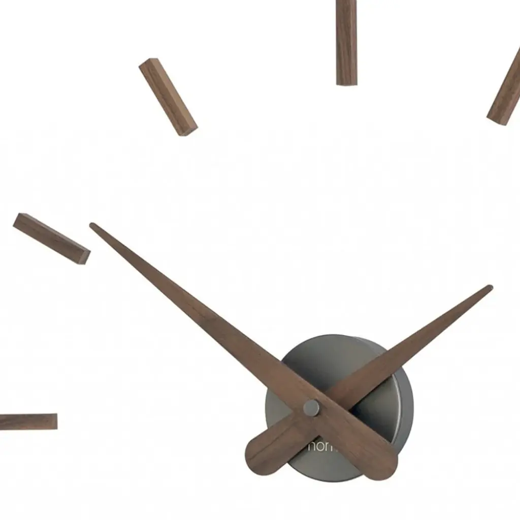Rich walnut distinguishes the extended hour markers of Sunset, adding warmth to a wall along with impeccable timekeeping via the clock’s German-origin quartz movement. Easy installation with adhesive brings versatility to Nomon’s handmade timepiece, with the choice of a metal or wood center box.