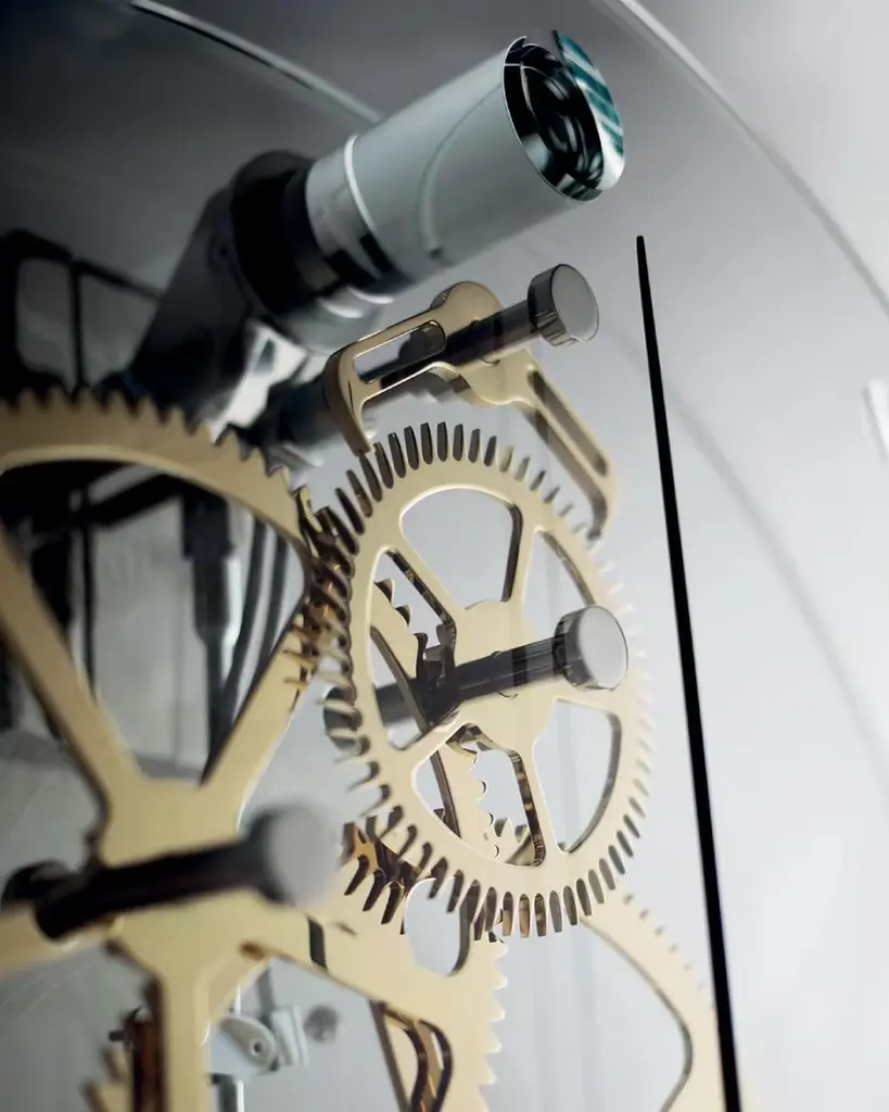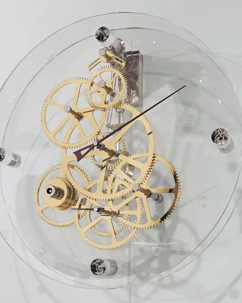 Presto wall pendulum clock designed by Gianfranco Barban for Teckell is a part of Takto timepieces collection. This gorgeous timepiece is the modern definition of time. The Graham escapement is visible within the two crystal disks that make up the structure. The pendulum rod is made of Invar, a metal alloy with a very low thermal expansion coefficient, with a compensation tube for temperature variation. The clock has a stainless steel arbor with revolution on 15 ball bearings. DLC-coated gears and pinions and a charge autonomy: 7+1 days / Charge reserve: up to 5 minutes. 24K gold-plated gears and pinions.Indoor use only.DIMENSIONSL 26" x W 9" L 66 x W 23 cmLEADTIME: Most Teckell products are made-to-order with a lead time of 4-6 weeks ex-factory; selected products may however be in stock. Please inquire with us for details.