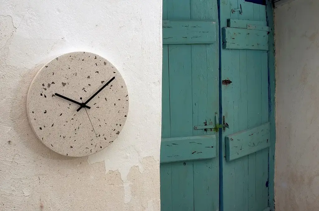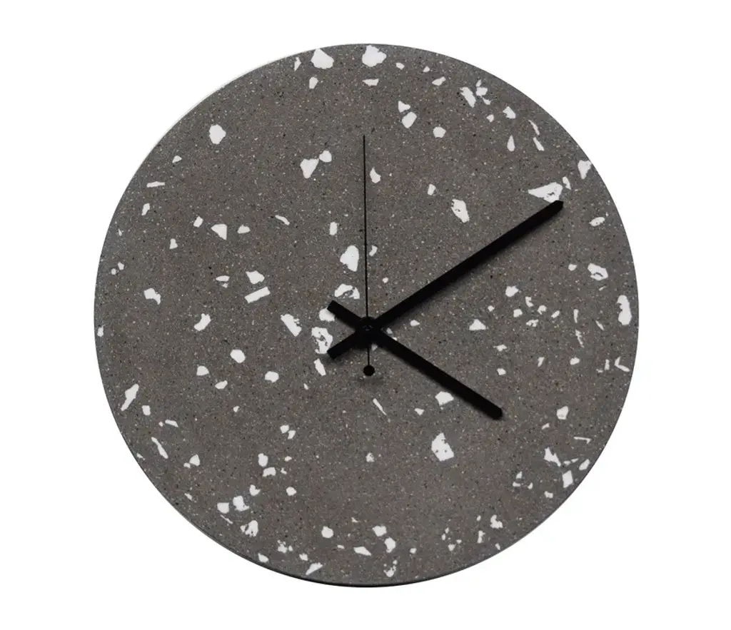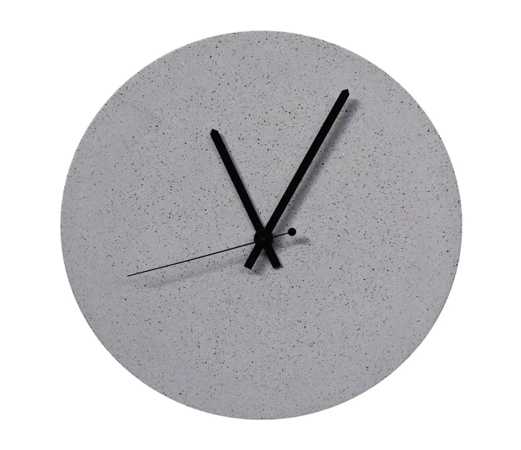 TEMPUS wall clock, designed by Urbi et Orbi Studio in 2013.Tempus is designed to resemble a painting, with its primary theme being the showcase of concrete and its aesthetic finishes. The clock mechanism and hands symbolize the lifespan of concrete. While this is our unique interpretation, TEMPUS is also a beautiful wall clock with multiple variations, adding character to any space.It is available in 4 shades of grey, and various colors ranging from warm to cool tones such as beige, terracotta, olive green, dusty blue, etc. It can also come in a terrazzo or sand finish.