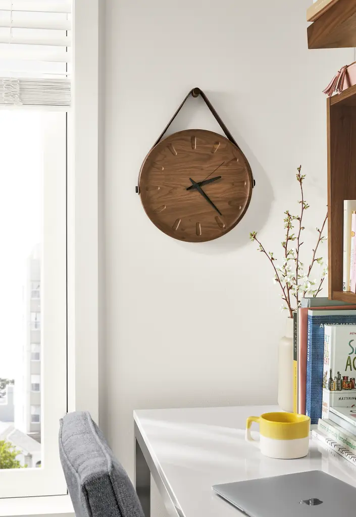 Handcrafted by artisans at a family-owned shop in Vermont, the Toland wall clock brings the warmth and character of solid wood to old-school analog timekeeping. Subtle hour-mark indentations, knurled steel accents on the sides and the leather hanging strap are unique details that lend a homey feel to your entryway, living room, bedroom or kitchen. The Toland wall clock includes a solid wood peg with a screw and anchor for easy hanging.