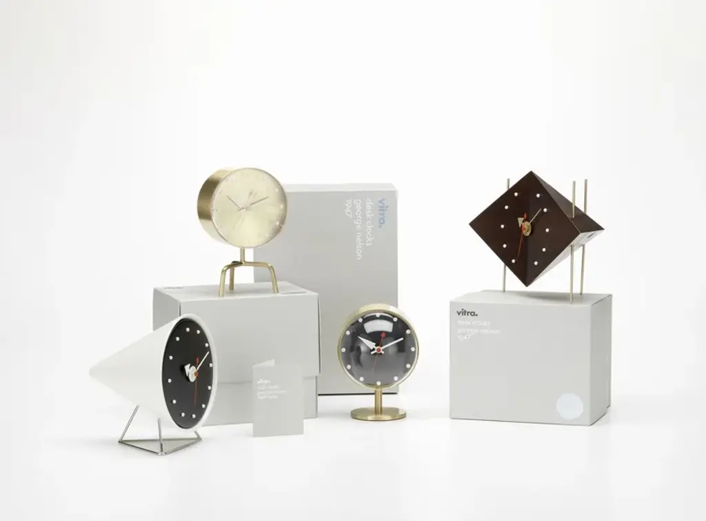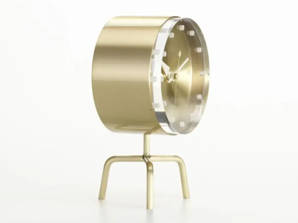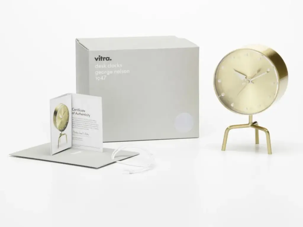 Tripod Clock is a brass table clock, part of George Nelson's Desk Clocks collection.In 1947, the American designer George Nelson was commissioned to create a collection of clocks. Nelson analysed how people used clocks and concluded that they read the time by discerning the relative position of the hands, which made the use of numbers unnecessary. Furthermore, since most people wore wristwatches, he assumed that clocks had become more of a decorative element for interiors.These ideas provided the basis for the first collection of 14 timepieces, consisting of a completely new style of wall clocks and compact table clocks, which were launched on the market in 1949. Although the models all shared one common feature – the absence of numbers – the diversity of their shapes, colours, materials and designs could hardly have been greater.In the 35 years that followed, the designers at Nelson Associates conceived more than a hundred different clock models: wall clocks, portable table clocks and built-in clocks. After Nelson’s death in 1986, his archival estate, encompassing roughly 7400 manuscripts, plans, drawings, photographs and slides dating from 1924 to 1984, was acquired by the Vitra Design Museum.Vitra began reissuing the Nelson Clocks in 1999 and updates the collection from time to time. The Desk Clocks are available in various shapes and materials. Equipped with high-quality quartz movements, they continue to offer a refreshing alternative to conventional clocks.Materials:- Materials: brass, acrylic glass, polyurethane, solid walnut.- Product contents: high-quality quartz clock movement, 1.5 volt battery included.- Origin of wood: walnut (Juglans nigra) from Western Europe and/or Poland.