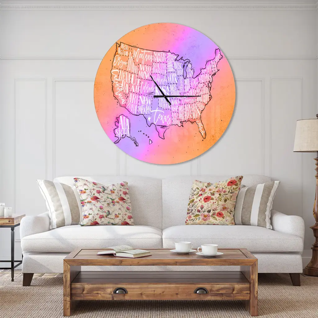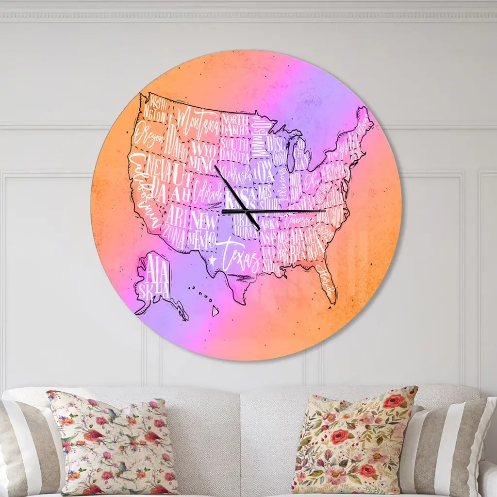 A beautiful addition to any home or office, this Farmhouse round wall clock is made on 100% solid aluminum. It has a highly reflective glossy finish creating a sleek modern look. This United States Yellow Vintage Map wall clock arrives completely ready to hang on the wall. Simply insert the �AAA� battery included with your order.Available in several size, this Modern Oversized Clock makes it the focal point of any room.Features - Ultra Gloss Coating ensures colors are extra vibrant with light reflection. - 1mm Aluminum grade sheet metal. - 1-inch mounting frame gives the illusion of artwork floating on the wall. - Mounting brackets and instructions are included. - High quality digital images are created directly into a glossy aluminum panel, producing a stunning and captivating print in the glossy finish of the metal. - Looks better than any photo paper and guaranteed to last at least 20 years. - Easy to clean with a microfiber cloth. - "AAA" battery included with your order. - Easy to hang. - Style: Farmhouse - Material: Metal - Shape: RoundSee Options drop down for available sizes.