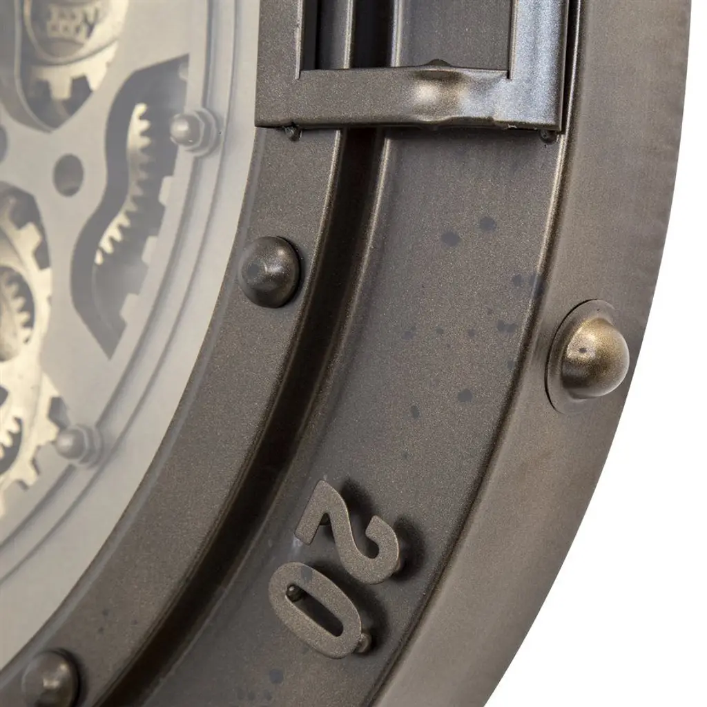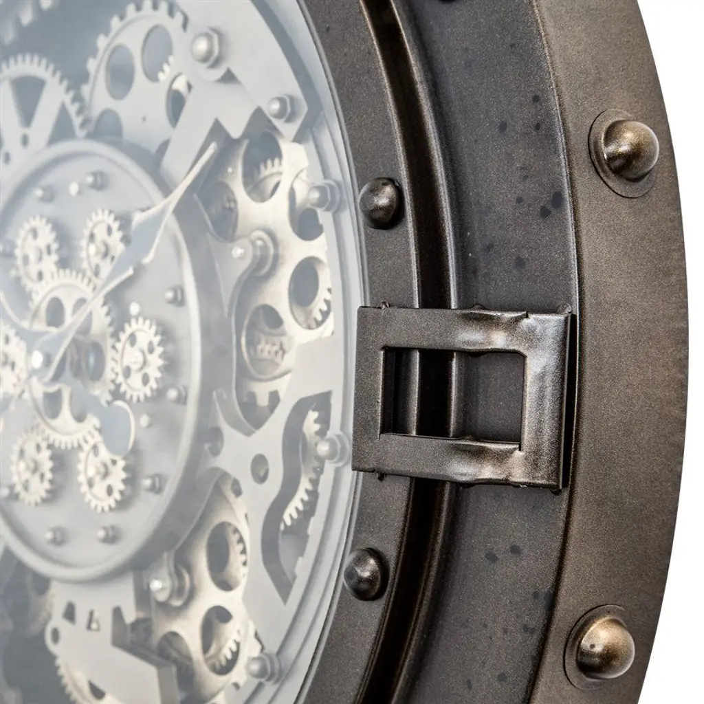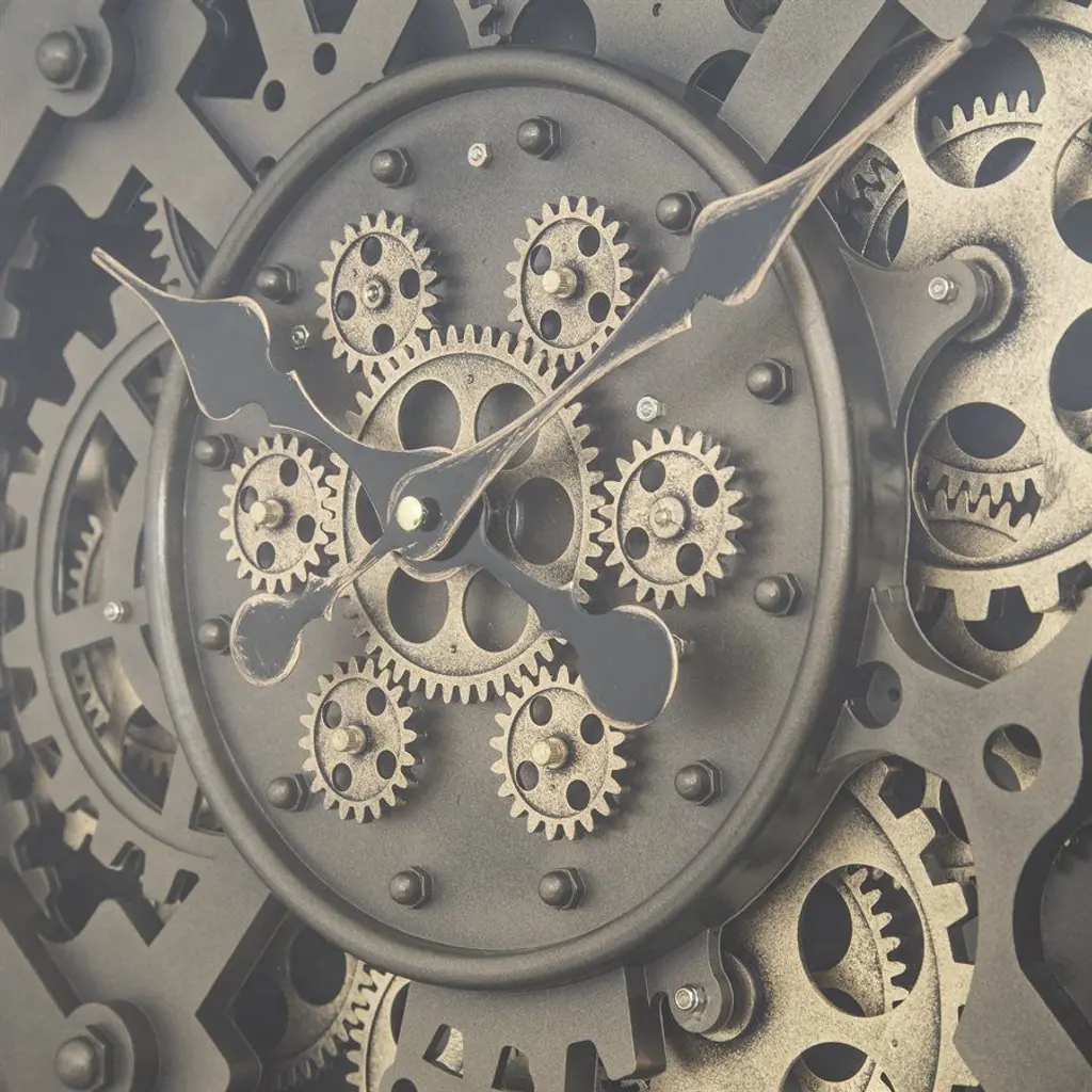 Urban Loft Gears Wall Clock. This wall clock combines industrial style with functional timekeeping through its distinctive gear mechanism display. The clock features a quartz movement that powers the black spade hour and minute hands.No particle board. Fully assembled. Manufacturer: Yosemite Home Decor.