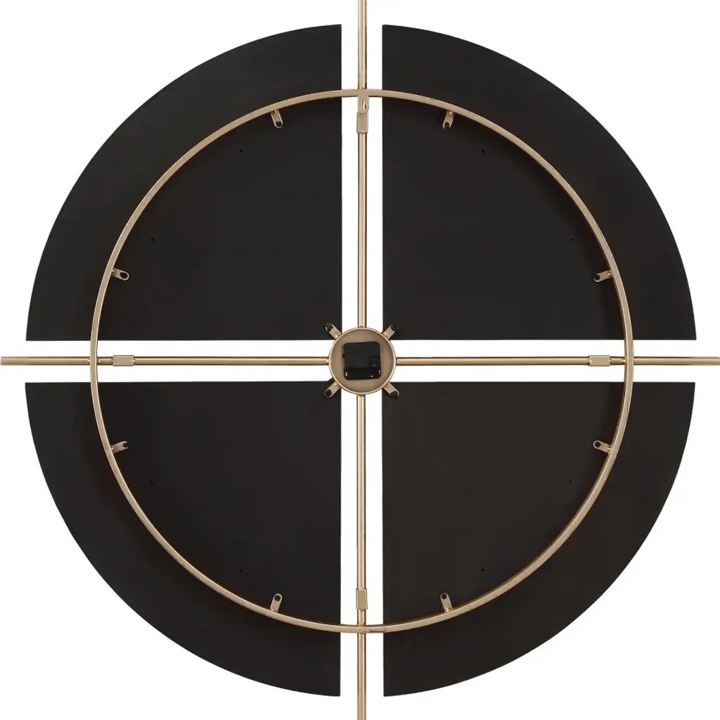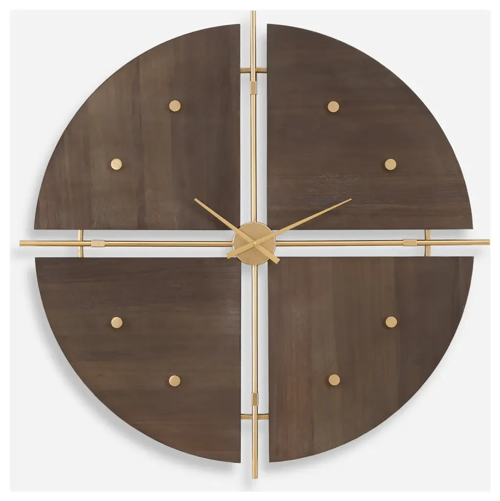 This Unique Clock Is A Harmonious Blend Of Form And Function, Divided Into Four Seamlessly Pieced Sections, Each Graced With A Luxurious Walnut Veneer. The Intersecting Iron Rods Add A Touch Of Sophistication, Finished In A Radiant Metallic Gold. Quartz Movement Ensures Accurate Timekeeping. Requires One "AA" Battery. Wall Clock from the Walnut Elegance collection in Metallic Gold finishThis Unique Clock Is A Harmonious Blend Of Form And Function, Divided Into Four Seamlessly Pieced Sections, Each Graced With A Luxurious Walnut Veneer. The Intersecting Iron Rods Add A Touch Of Sophistication, Finished In A Radiant Metallic Gold. Quartz Movement Ensures Accurate Timekeeping. Requires One "AA" Battery.Width: 42.13"Height: 42.13"Weight: 14.00 lb