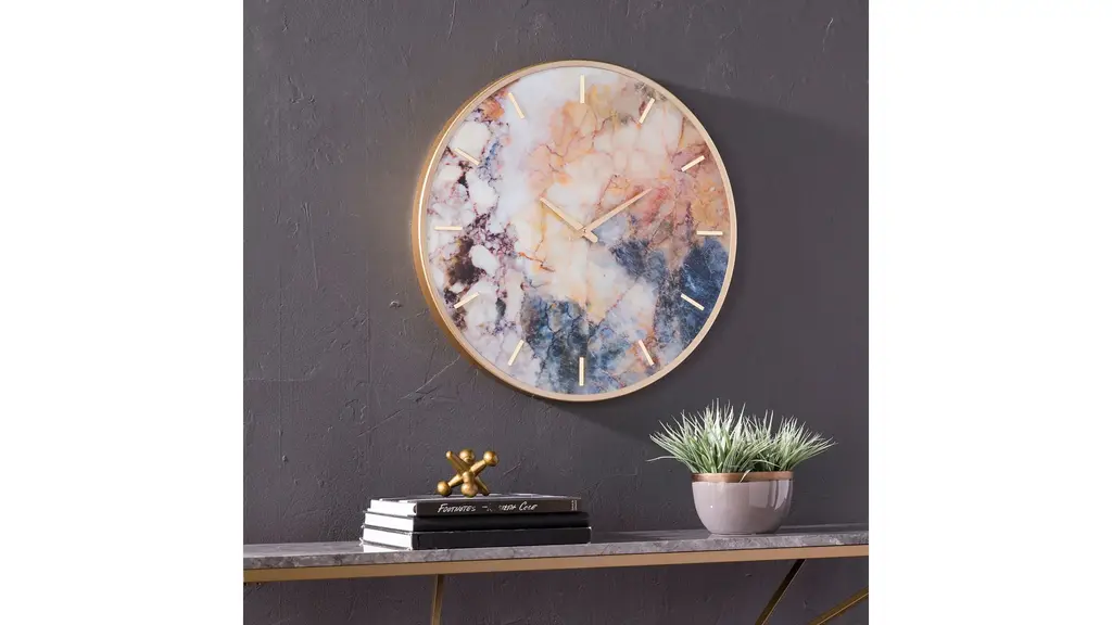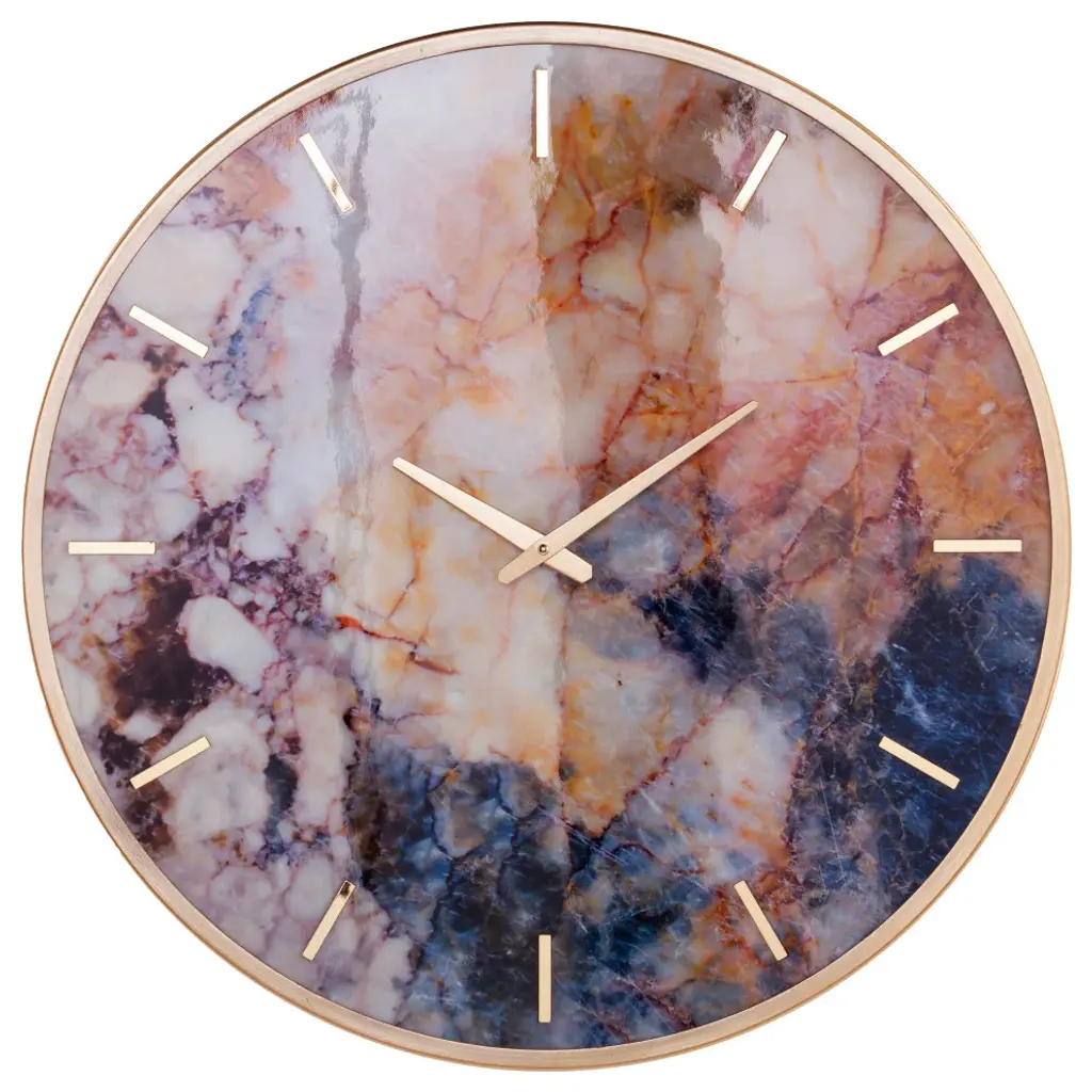 Make an impact on your space with the Uttoxeter Wall Clock. The range of tones in the clock face create a galactic, interstellar feel, especially in the nebulous watercolor pattern. Simple hatch marks signify the numerals, and a golden frame trims the diameter, both lending to the clock's style. This oversized wall clock brings function, while also adding vibrancy and boldness in an artistic way.