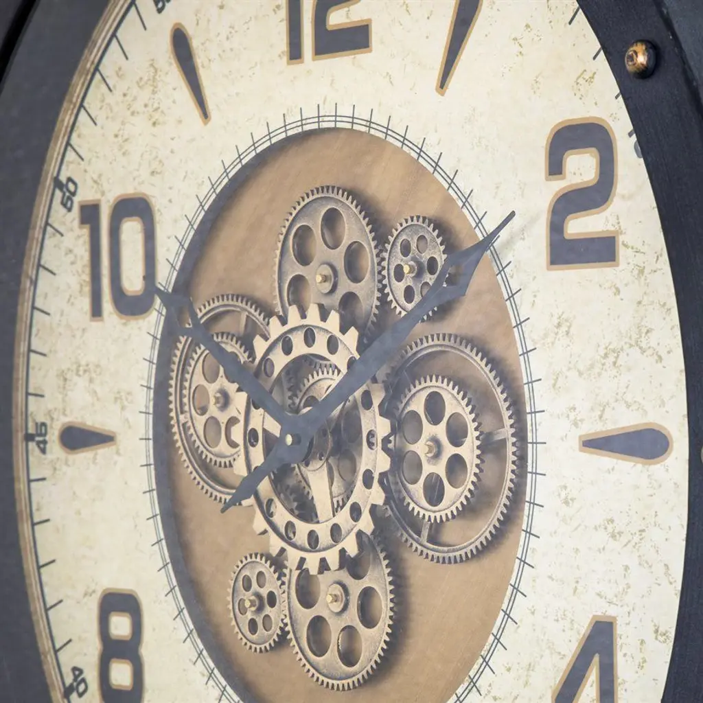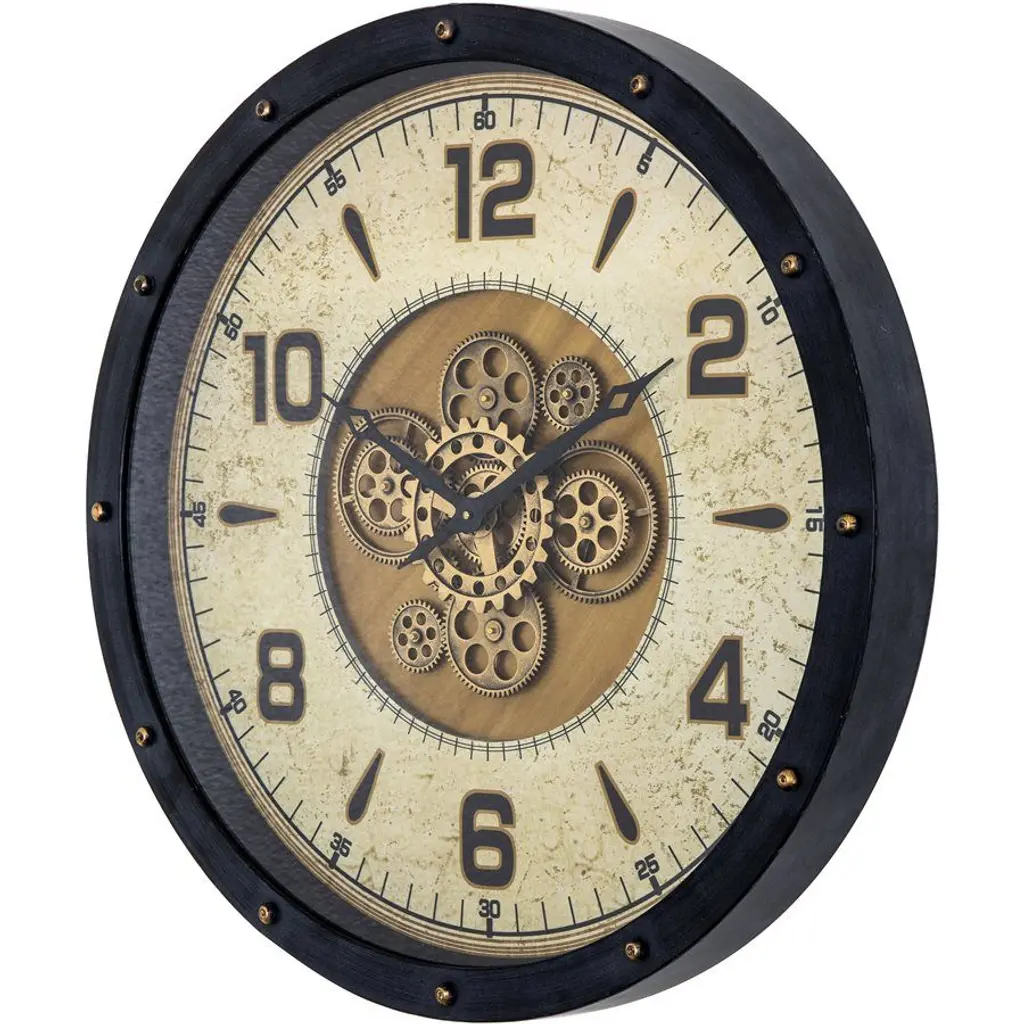 Venetian Round Gear Clock. This wall clock features a black metal frame with a gold face and visible moving gears. The dual movements track time while creating visual interest.No particle board. Fully assembled. Manufacturer: Yosemite Home Decor.