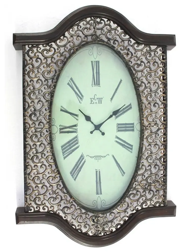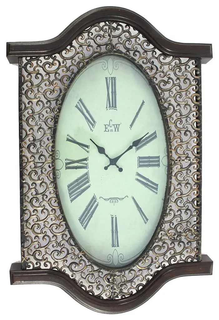 WD-031 Vintage Bronze Wall Clock, Teton Home WD-031 Vintage Bronze Wall Clock features with classic retro European style. Its top and bottom wooden frames with antiqued bronze finish make this piece a stable construction with elegant scrolling metalwork main body. It will easily complement the existing settings in your home.. It is a bronze finished wall clock; wooden frame with metal construction. 31 x 20 x 3.Model No : WD-031Brand : Teton HomeVintage Bronze Wall Clockvintage collectionbronze wooden framescrolling metalwork main bodyroman numeralsUPC : 035127516967