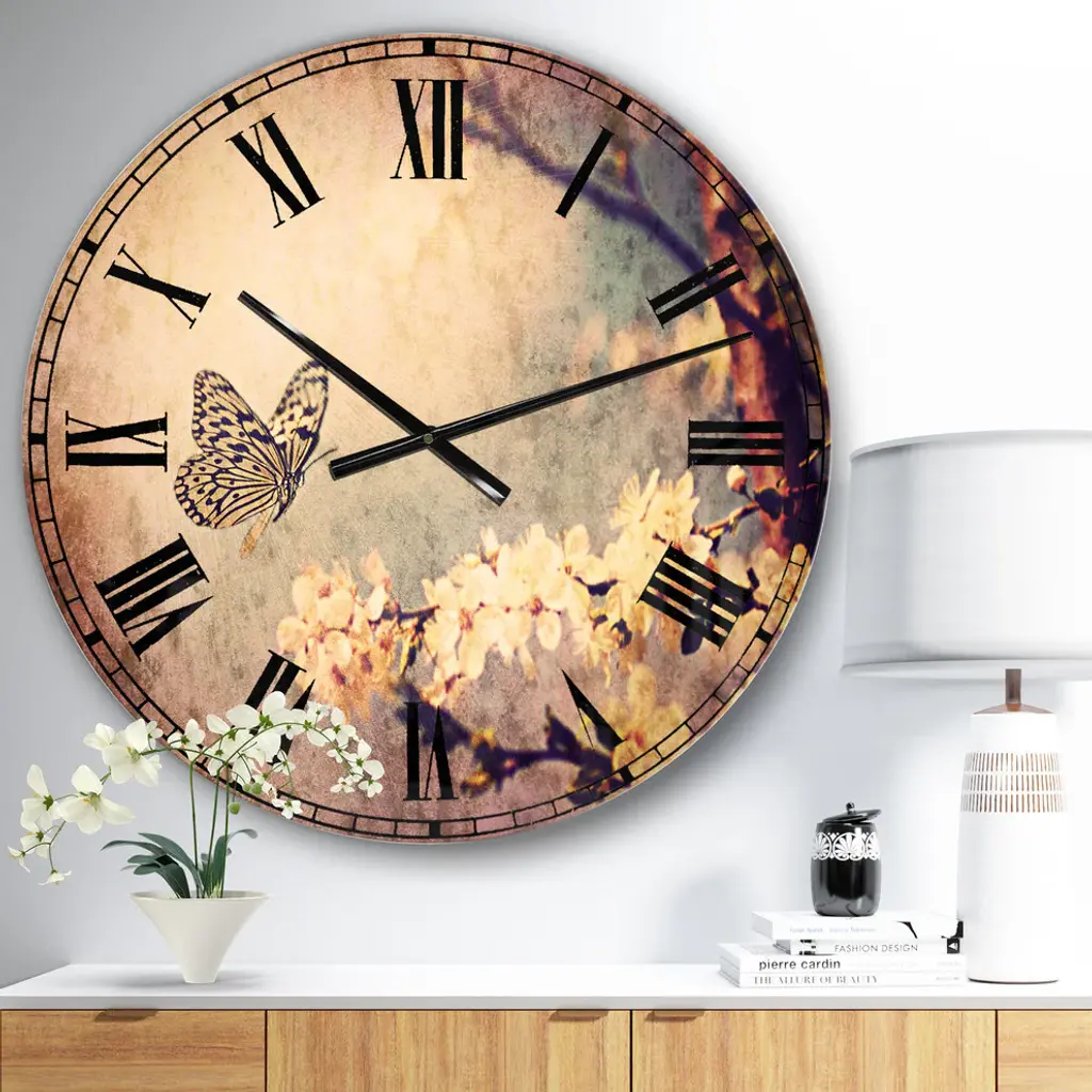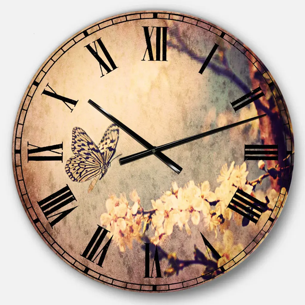 Vintage Butterfly And Cherry Tree Floral Round Wall Clock, 23x23