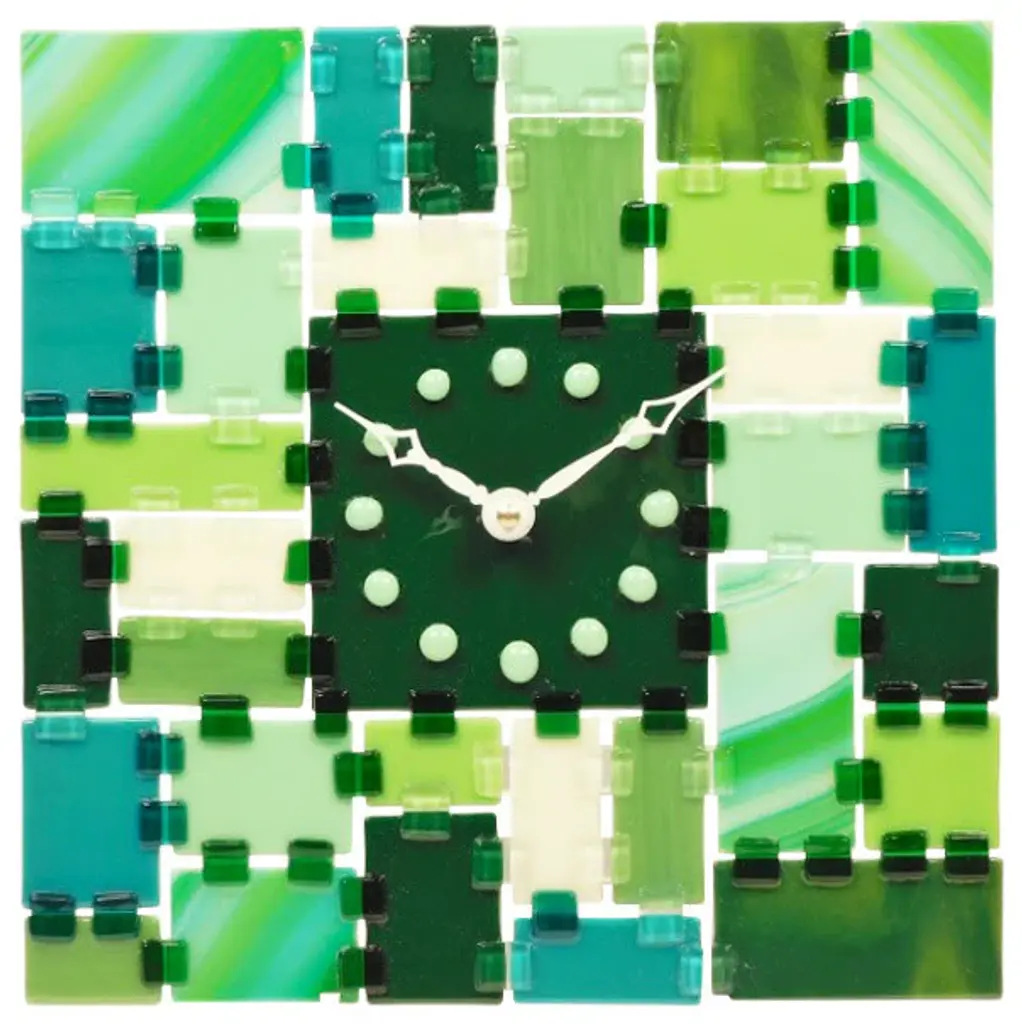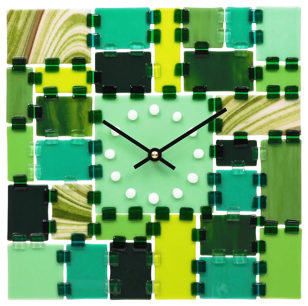 This is a medium-size handmade square wall clock. They are composed from small colorful glass rectangles fused with each other by tiny glass bridges. The actual glass shapes and colors may be slightly different.