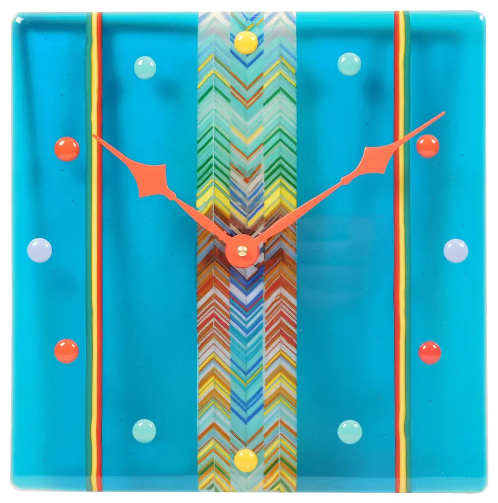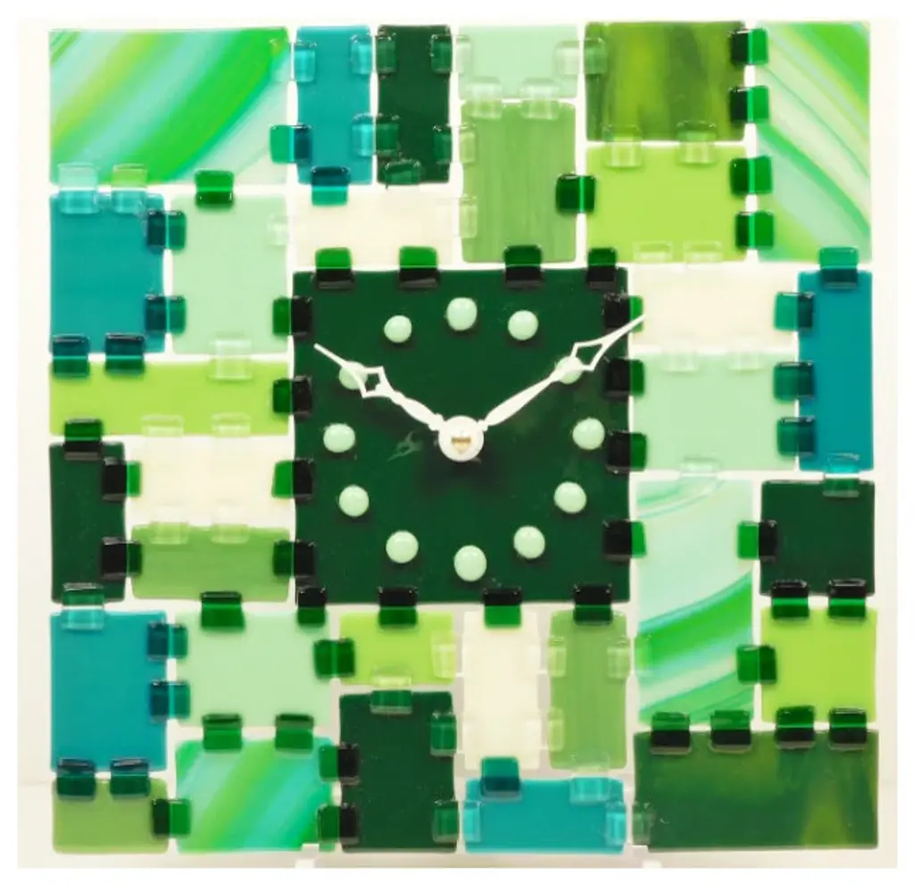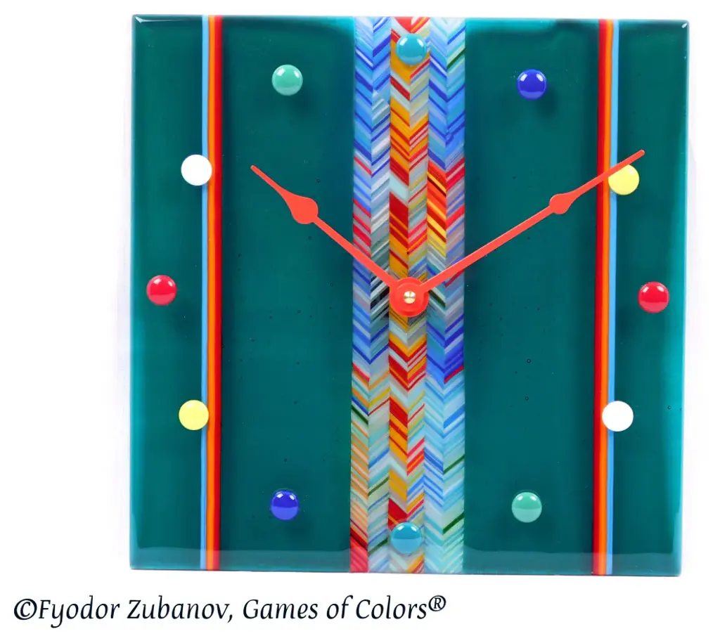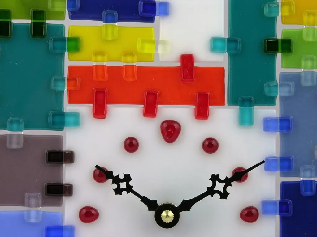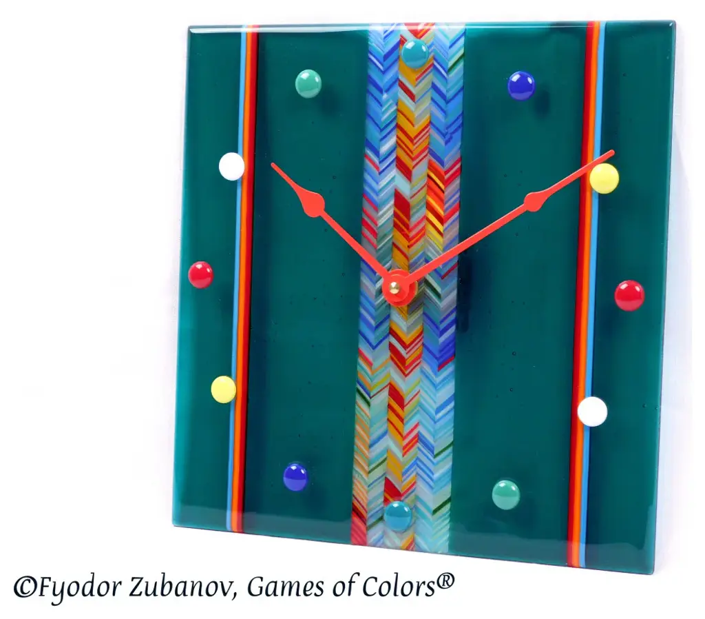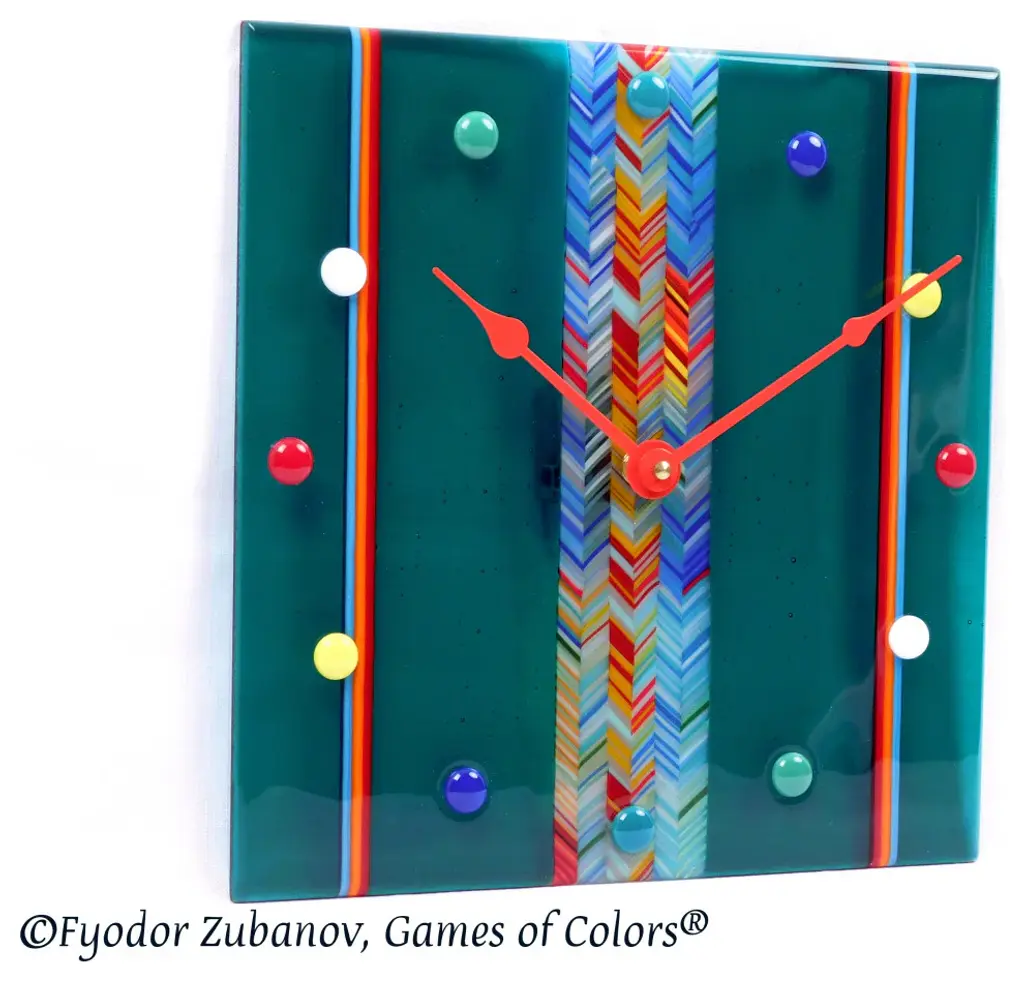 This elegant beautiful fused glass wall clock looks like popular candies laying on a colorful transparent surface. No numbers, just blue, green, yellow and white pebbles-"candies". Red hands enhance this illusion and compliment color harmony. The surface transparency makes an illusion of lightweight "flying" body. The central part has a unique striped pattern which may differ from the shown at the pictures.The clock may find their place in any room.This clock is battery powered and very precise. Almost no maintenance required: simply change time in Spring and Fall to follow DST. Battery usually lasts 1.5-2 years depending on brand.