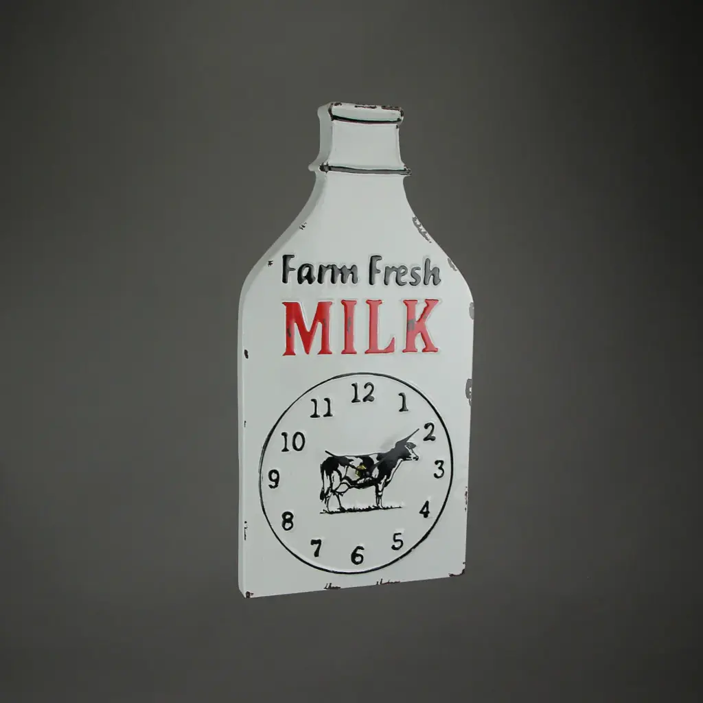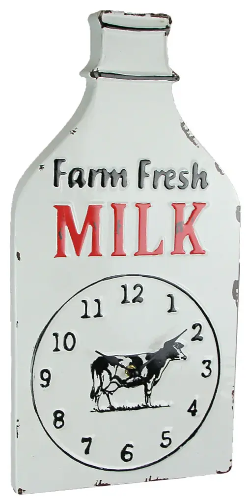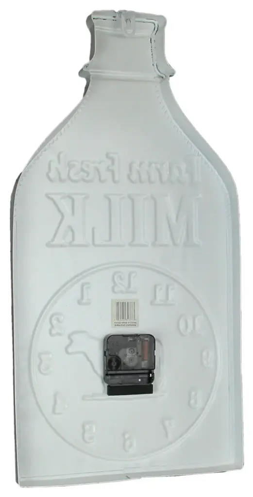 OVERALL SIZE - 19 Inches High, 10.25 Inches Long, 1.5 Inches DeepDURABLE MATERIAL - Crafted of Metal For Years of Maintenance Free DisplayCORDLESS - Clock Runs on 1 AA Battery (Not Included)FARMHOUSE DECOR - Great For Your Living Room, Kitchen, Bedroom, or DenGREAT GIFT - For Yourself or Friends And FamilyThis cool clock brings an antique farmhouse feel with its retro quart milk bottle design. The wonderful white enamel shows wearing on the edges, giving it an antique appearance, and the clock face looks beautifully oxidized and aged. The quartz movement requires just 1 AA battery, not included. This beautiful antique style wall clock is a stylish piece for your country living room or kitchen.