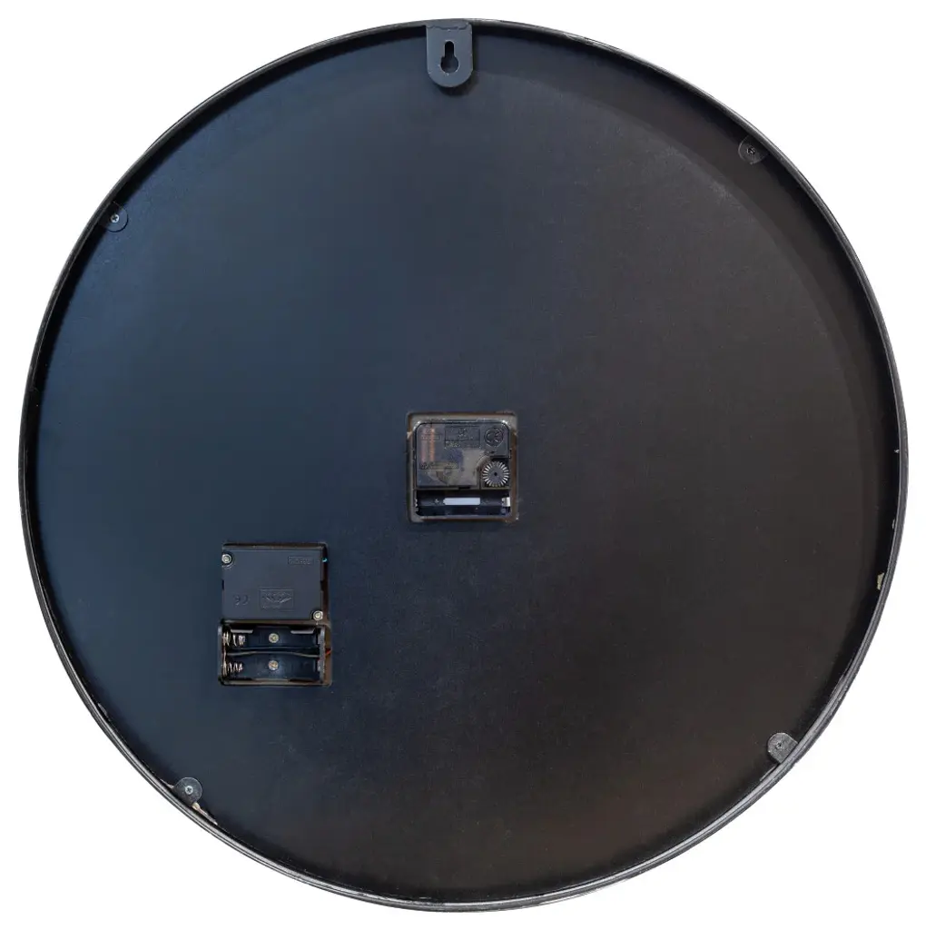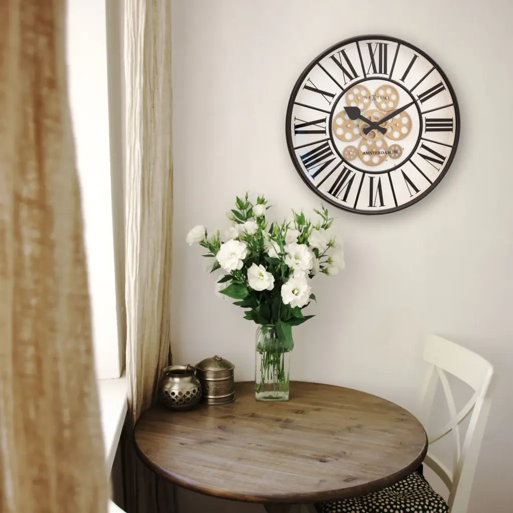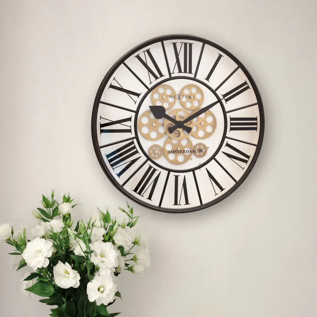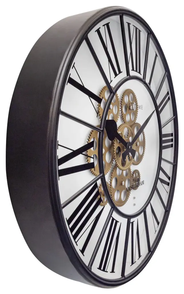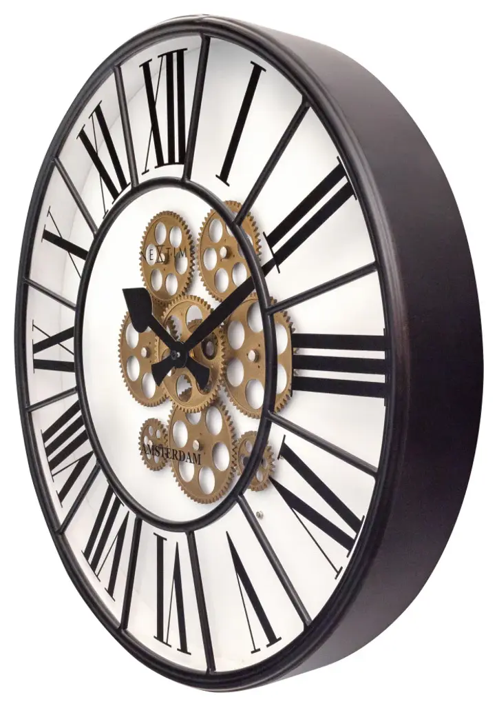 This NeXtime "William" large industrial metal wall clock, 19.8 inces (50cm) in diameter, is designed to showcase moving gears for a stunning centerpiece. The large roman index printed on the glass lens and matching colored hands create a clear contrast against the dial. The moving gears operate separately from the clock and can be switched off. This clock runs on 3 AA batteries. (not included) Comes in black or white.