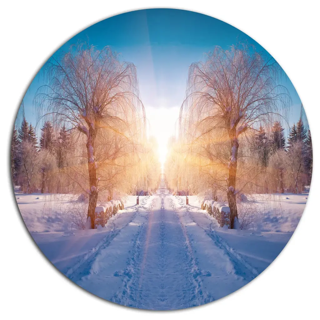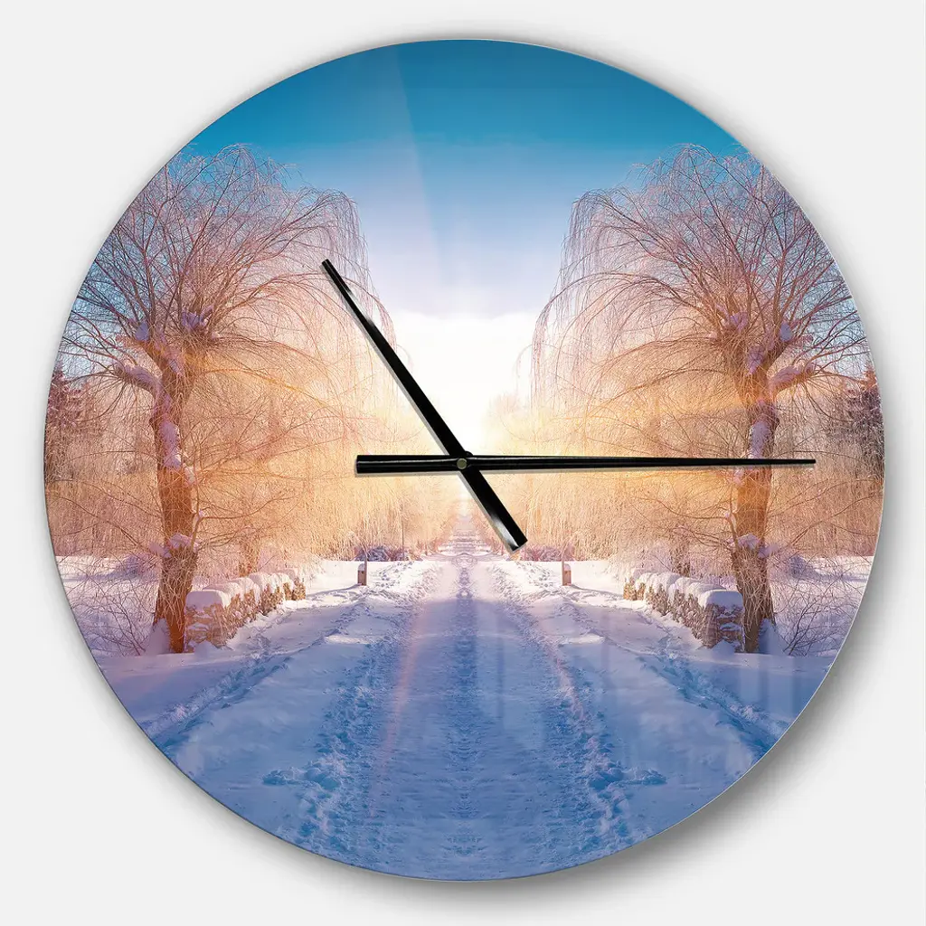 A beautiful addition to any home or office, this Modern & Contemporary round wall clock is made on 100% solid aluminum. It has a highly reflective glossy finish creating a sleek modern look. This Winter Landscape in City Park wall clock arrives completely ready to hang on the wall. Simply insert the �AAA� battery included with your order.Available in several size, this Modern Oversized Clock makes it the focal point of any room.Features - Ultra Gloss Coating ensures colors are extra vibrant with light reflection. - 1mm Aluminum grade sheet metal. - 1-inch mounting frame gives the illusion of artwork floating on the wall. - Mounting brackets and instructions are included. - High quality digital images are created directly into a glossy aluminum panel, producing a stunning and captivating print in the glossy finish of the metal. - Looks better than any photo paper and guaranteed to last at least 20 years. - Easy to clean with a microfiber cloth. - "AAA" battery included with your order. - Easy to hang. - Style: Modern & Contemporary - Material: Metal - Shape: RoundSee Options drop down for available sizes.