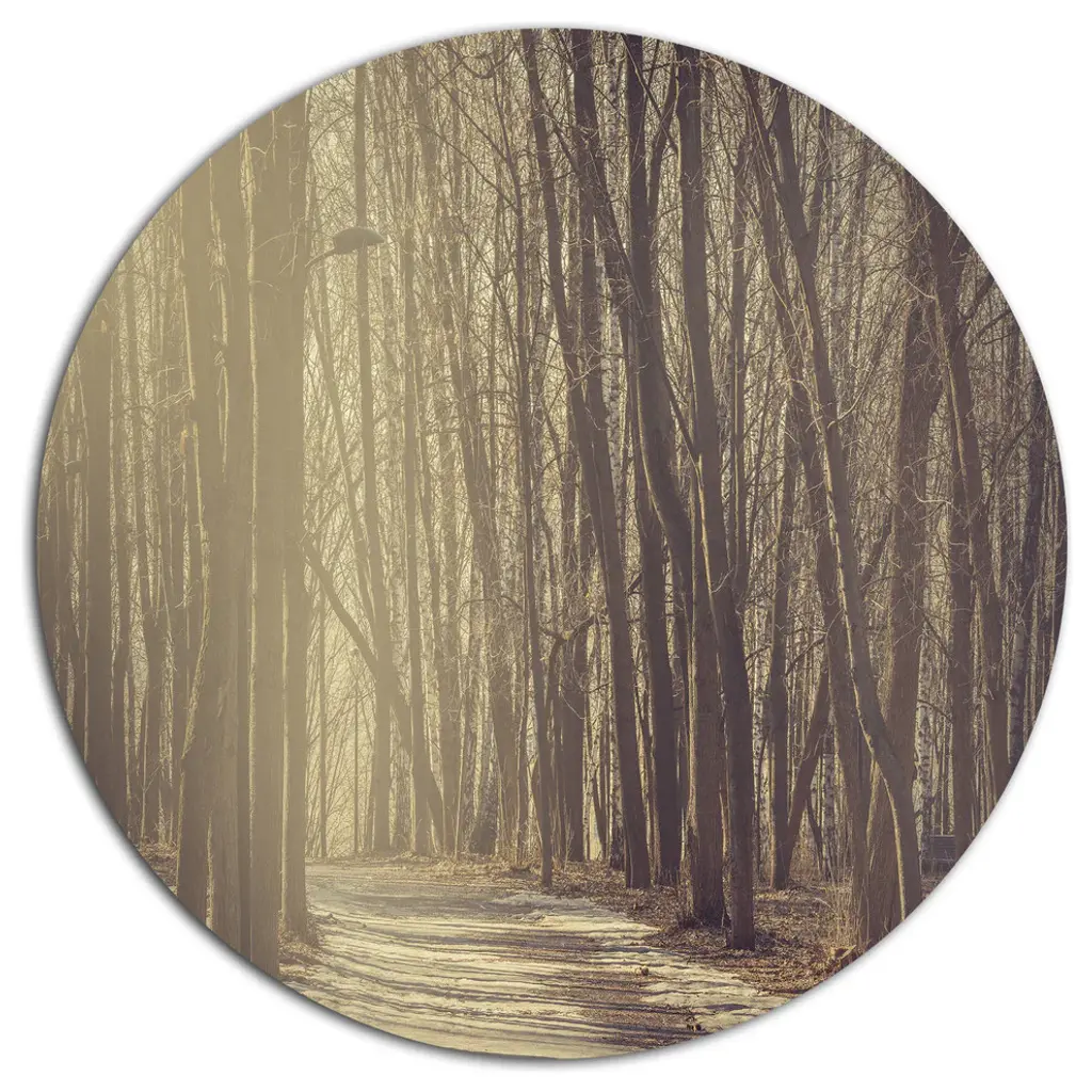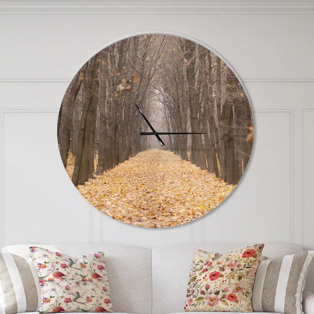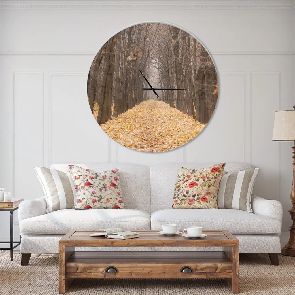 A beautiful addition to any home or office, this Farmhouse round wall clock is made on 100% solid aluminum. It has a highly reflective glossy finish creating a sleek modern look. This Yellow Road through Fall Forest wall clock arrives completely ready to hang on the wall. Simply insert the �AAA� battery included with your order.Available in several size, this Modern Oversized Clock makes it the focal point of any room.Features - Ultra Gloss Coating ensures colors are extra vibrant with light reflection. - 1mm Aluminum grade sheet metal. - 1-inch mounting frame gives the illusion of artwork floating on the wall. - Mounting brackets and instructions are included. - High quality digital images are created directly into a glossy aluminum panel, producing a stunning and captivating print in the glossy finish of the metal. - Looks better than any photo paper and guaranteed to last at least 20 years. - Easy to clean with a microfiber cloth. - "AAA" battery included with your order. - Easy to hang. - Style: Farmhouse - Material: Metal - Shape: RoundSee Options drop down for available sizes.