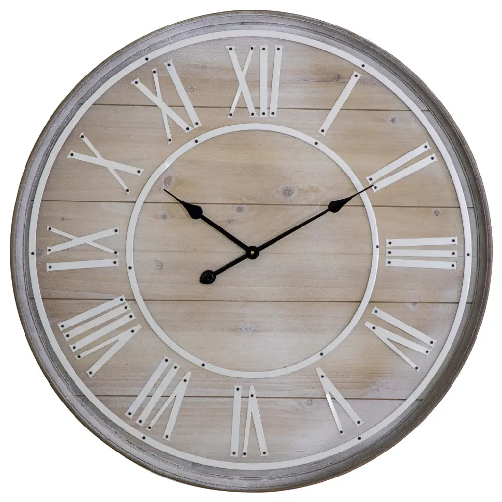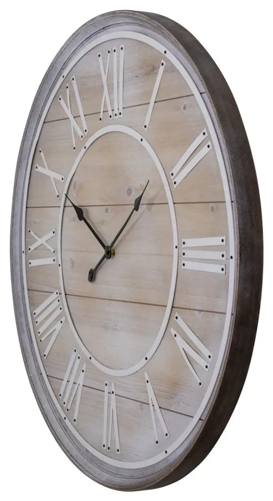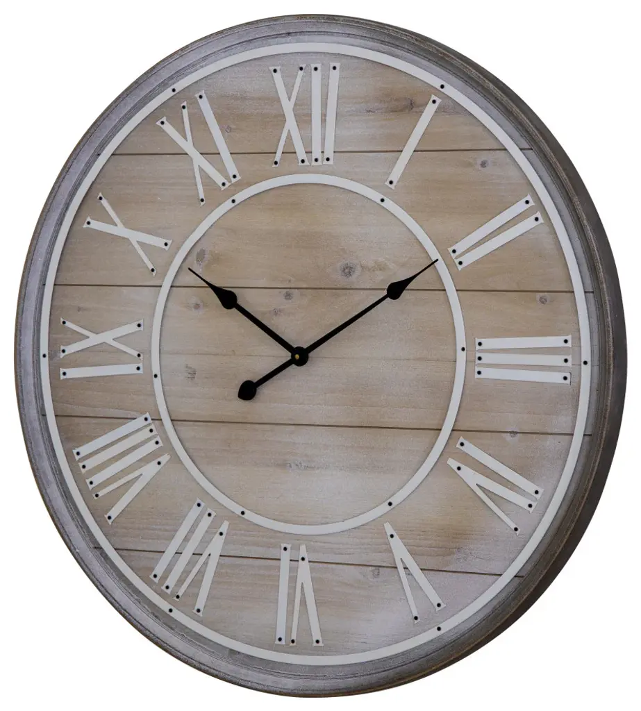 The Rustic Age Oversize Wall Clock has rustic appeal and country charm. Distressed wood and an antiqued face gives this clock a unique, industrial look, which blends well with a variety of different decors. Large numbers and bold hands make it easy to tell time at a glance. This clock is perfect for a living room, bedroom or entryway. This clock is a brilliant accent to any wall and will work well in either a home or office setting.