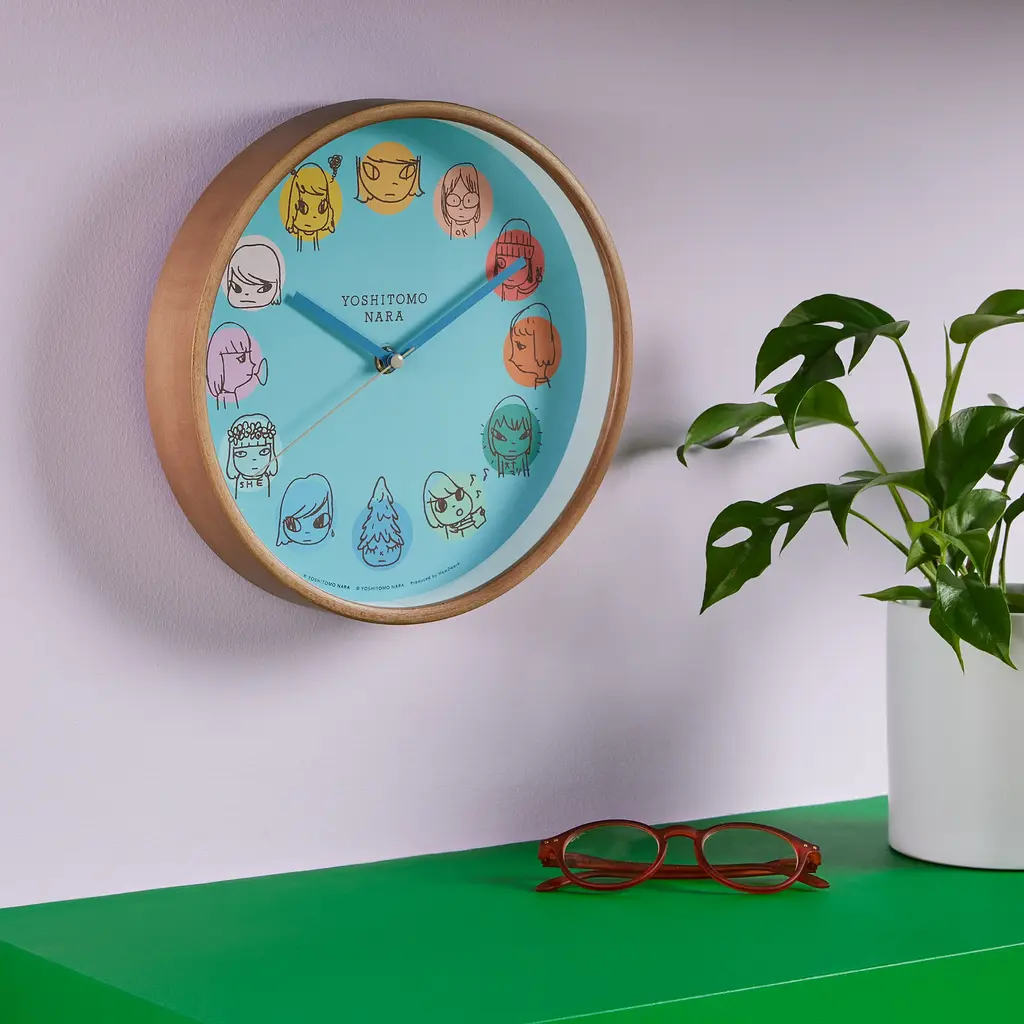While away the hours with Yoshitomo Nara’s slightly sinister yet cute girls. The Yoshitomo Nara Y.N. Wall Clock features 12 screenprinted faces handpicked from Nara’s 2021 artwork Thirty Faces to denote 12 hours. The clock has a plywood frame, a blue hour and minute hand and a white second hand. Yoshitomo Nara’s work is represented in MoMA’s collection. The Yoshitomo Nara Y.N. Wall Clock measures 1h x 10"diam. Requires one AA battery (not included).