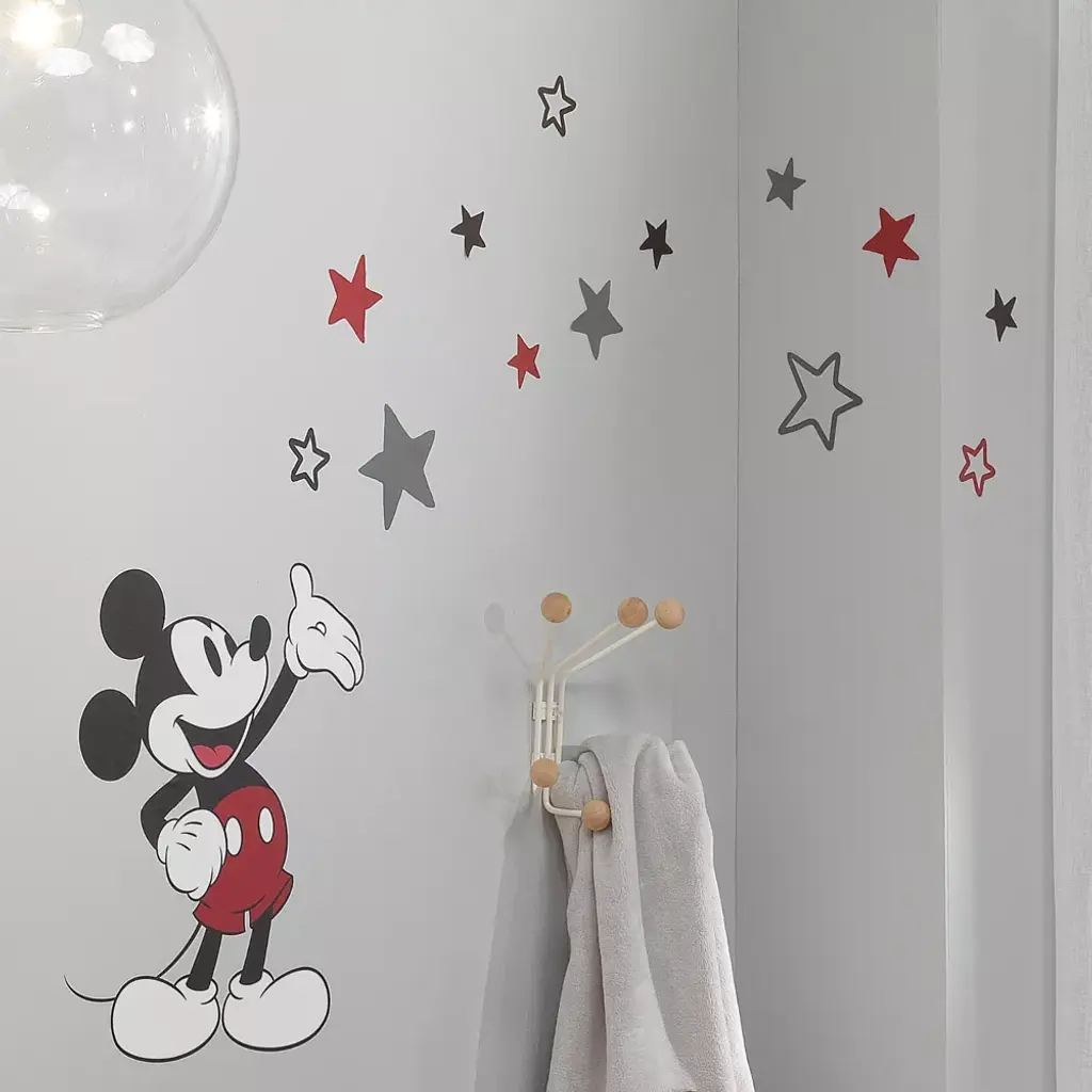 Complete this charming nursery with these custom wall decals. They add a designer touch to a feature wall in the baby’s room. Disney’s timeless Mickey Mouse is featured in his favorite red shorts and is surrounded by magical stars in black, red and gray. These wall decals create the look of a mural without any of the hassle of paint. They are easy to apply and easily removable. They will not harm your walls.