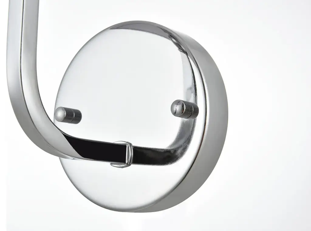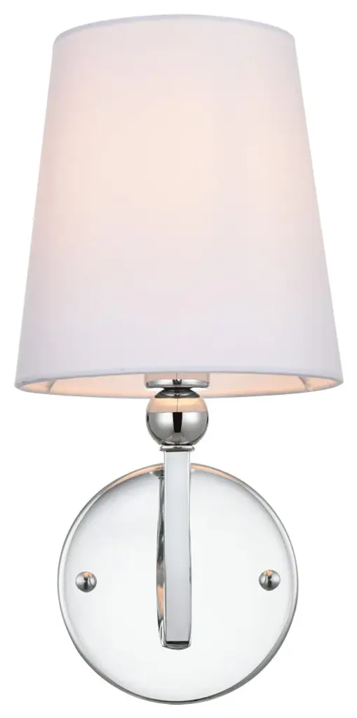 A modern twist on a traditional design, this vanity light is perfect for sprucing up your bathroom. Rated for use in damp locations, this iron fixture features a round backplate, curved arms, and fabric shade accents. Completely versatile, you can place this wall light as an uplight or downlight. Rated for use in damp locations, this will work perfectly over a vanity in your bathroom.illuminated by 1 E12 bulbs, light bulbs not includedcrafted with Metal and Fabric shadebackplate measures 4.7 inches wide x 4.7 inches high x 1 inches deepcan be installed as an uplight or downlightdimmable, compatible with a dimmer switch (not provided)hardwired, professional installation recommendedfabric shade filter light from the curved metal armed sconce