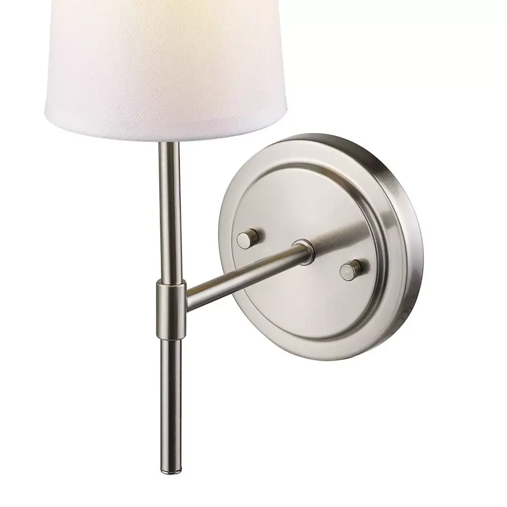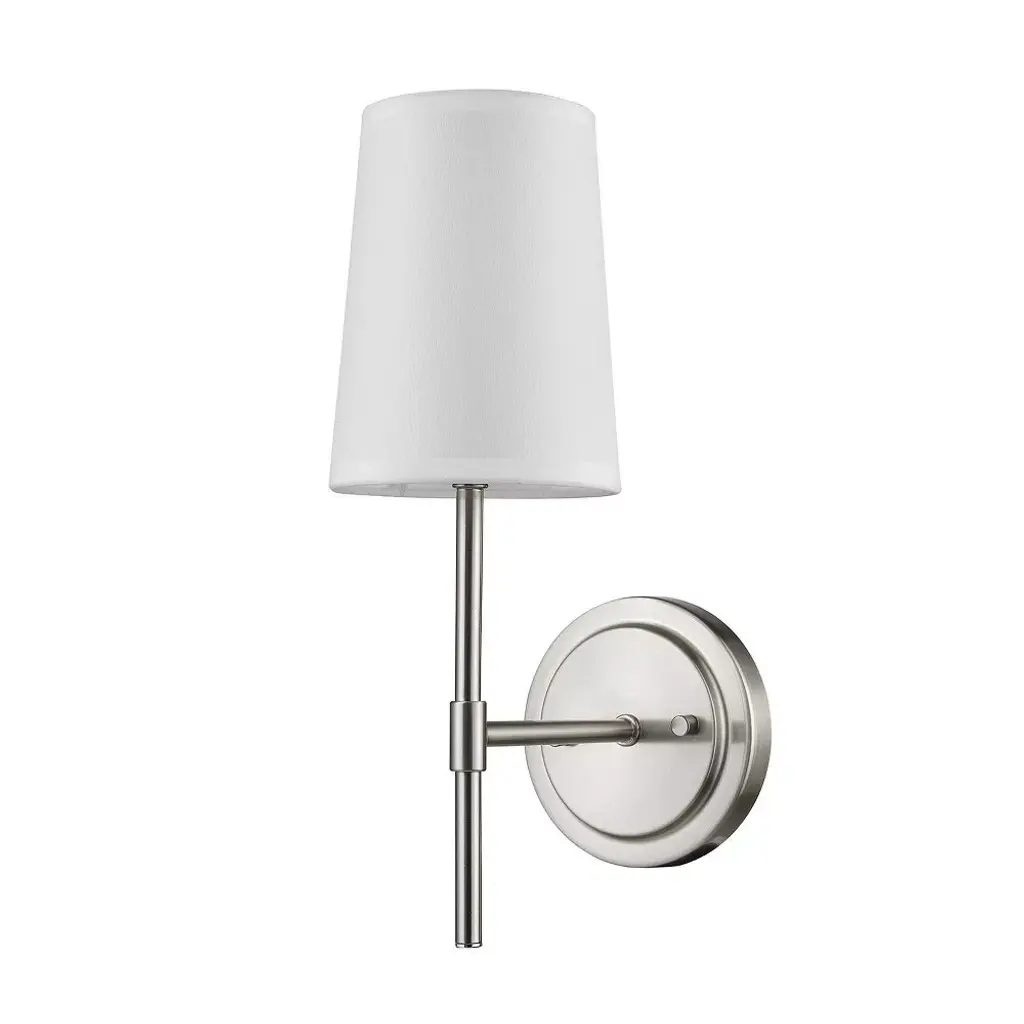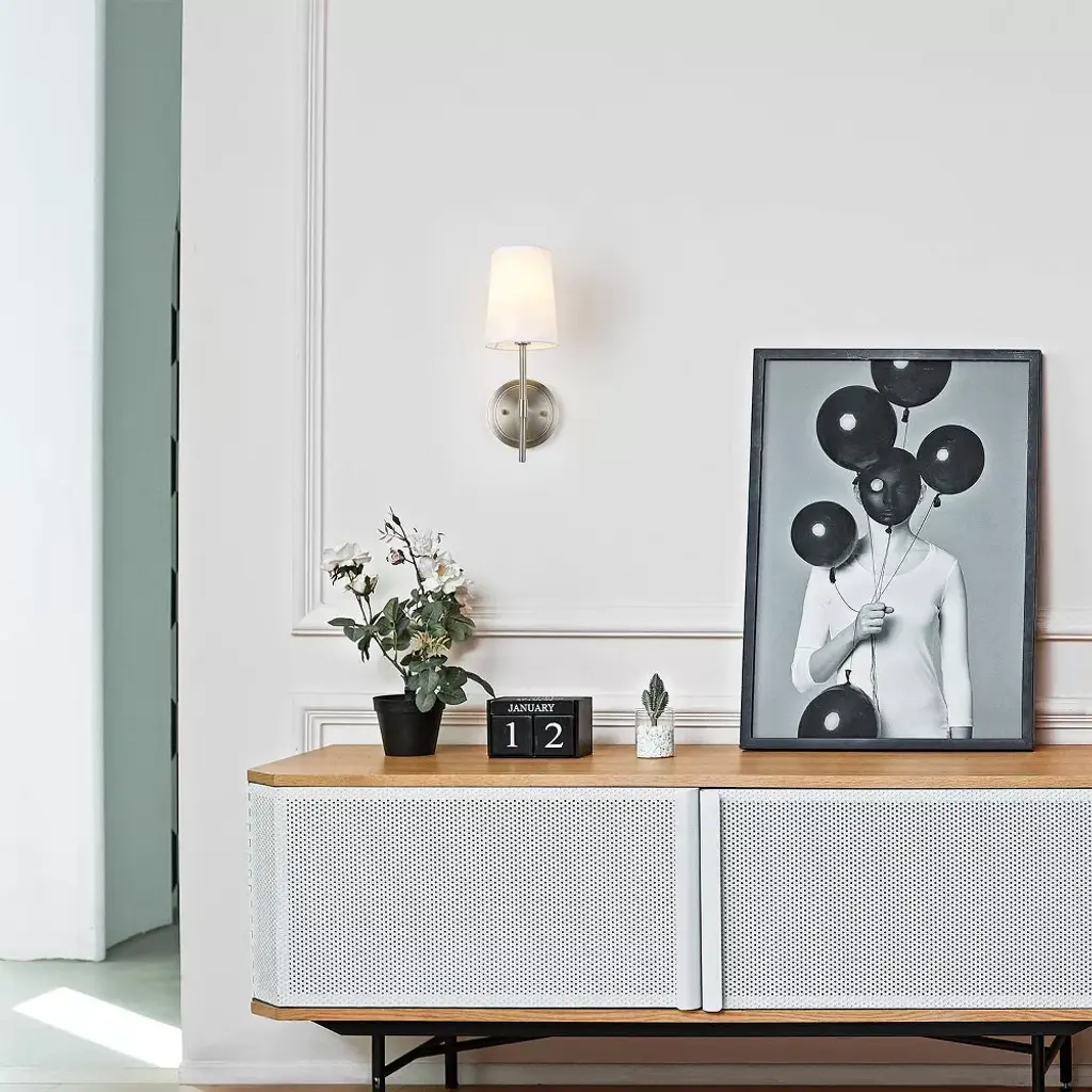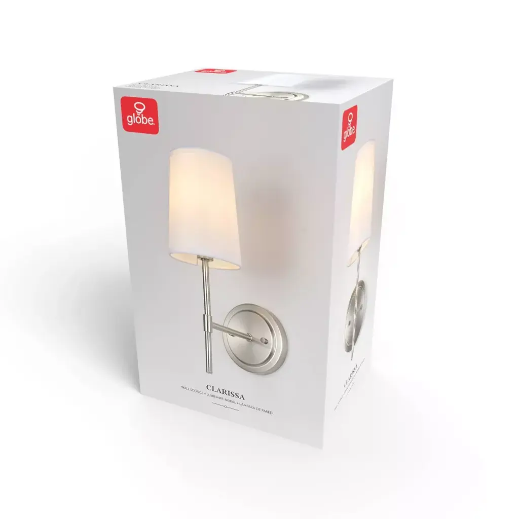 The modern design of Globe Electric's Clarissa Wall Sconce stands out in any home. The vintage lantern shape adds style to any space while the white fabric shade softly distributes light. A brushed nickel finish completes the modern glam motif. Perfect for placing on either side of your bed, above your sink in the kitchen, or above your couch in the living room as a stunning statement piece.