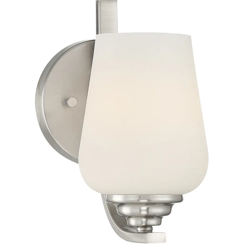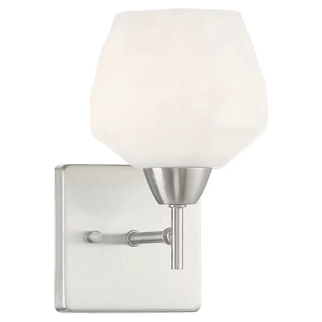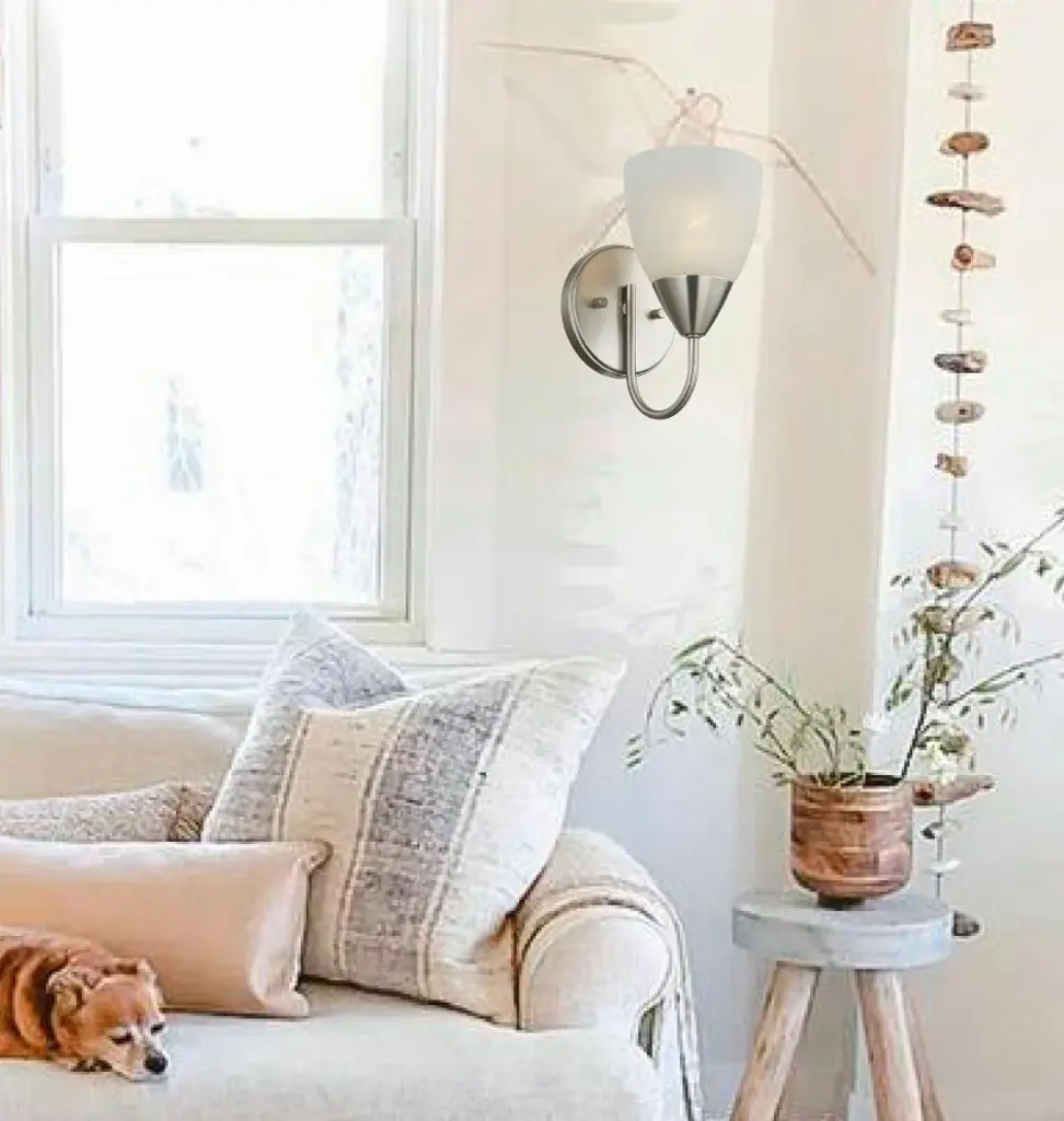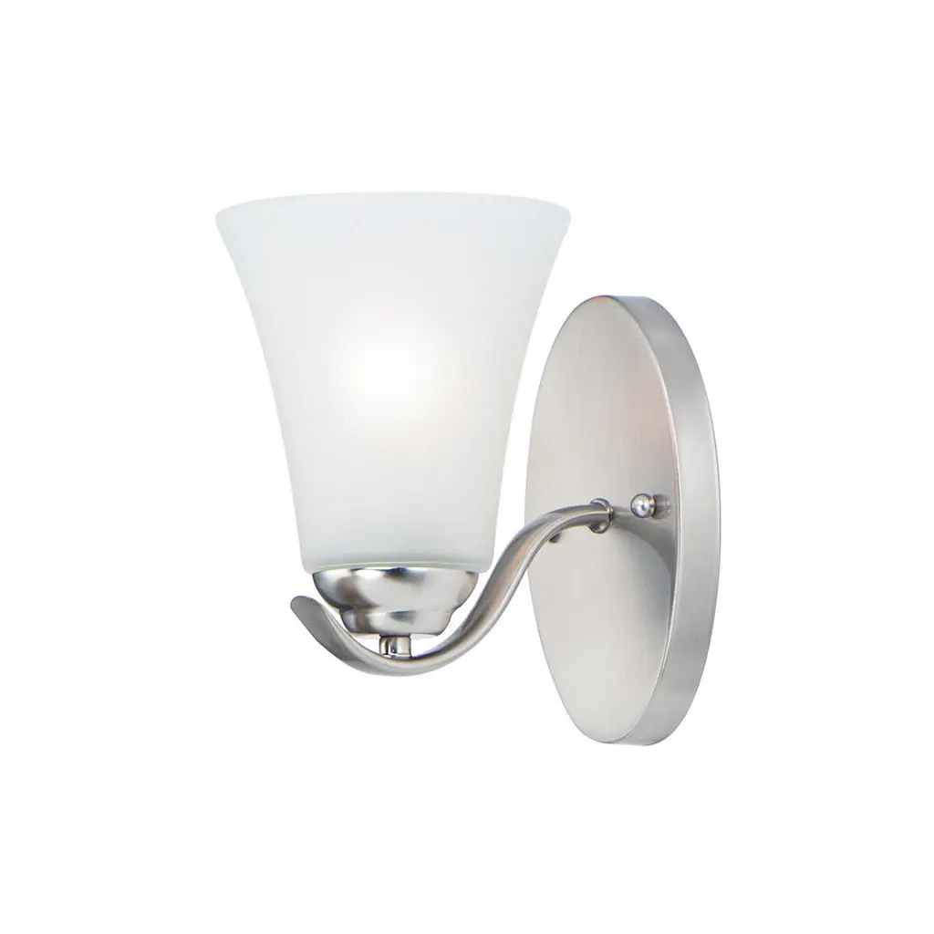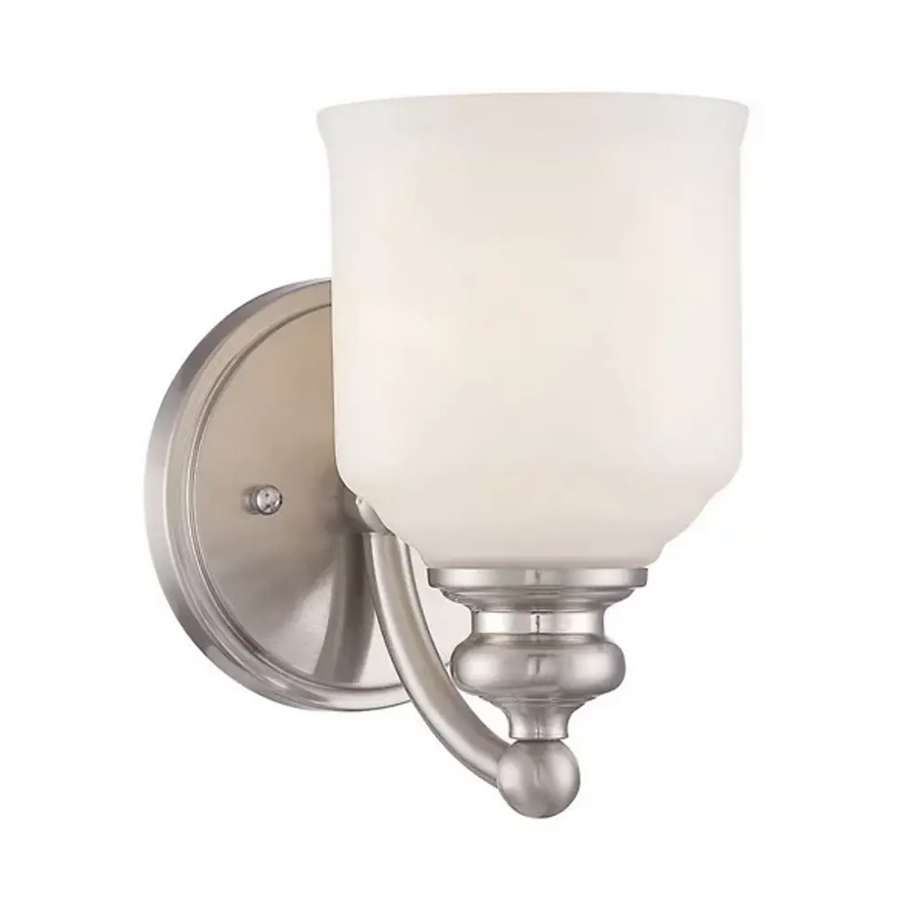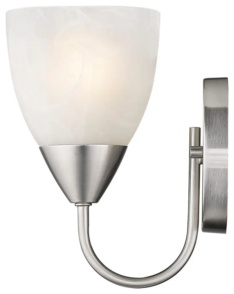 This Single Light Bathroom Sconce is crafted with etched alabaster swirl glass to cast a warm, bright glow in that breakfast nook or bathroom. The Clean Modern Shape mixes well with the traditional etched glass creating the perfect modern blend for your updated transitional space. Satin Nickel accents are the finishing touch to this easily placed and charming wall sconce. Rated for Damp Location this one-light sconce is ready to be installed in your bathroom, kitchen or commercial space.