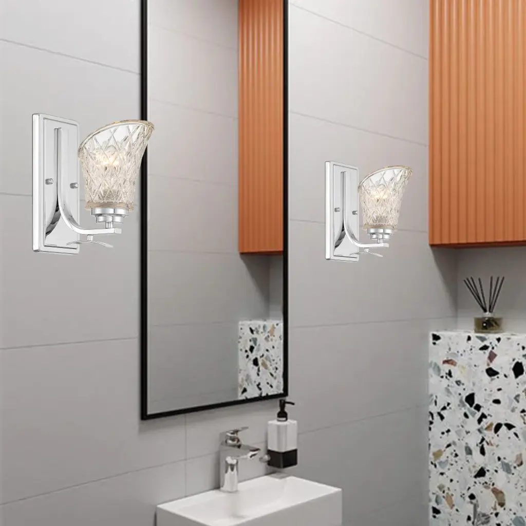 This 1-light wall sconce complements the modern style and adds warm light to your house. The rectangular backplate and the geometrically textured tapered lampshade, the combination of chrome and glass translucent colors, the rich colors will create an attractive environment. It can hold a 60w bulb (light bulbs not included) and has the function of dimming. You can install it anywhere in your home, such as the living room, bathroom, corridor, etc. Two years warranty is included.