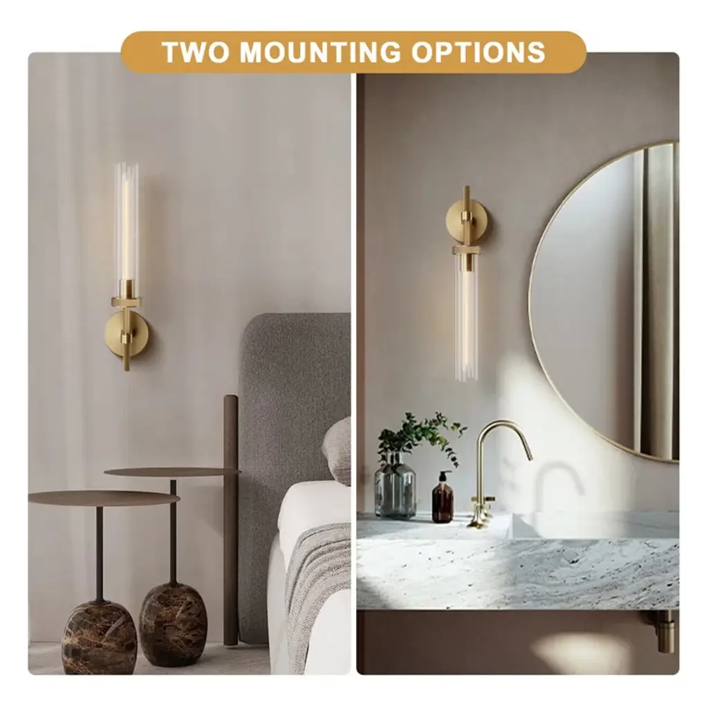 This wall light has a modern and industrial design style, elegant and beautiful. This wall mount light is made of high-quality materials, does not easily rust and fade, and has strong corrosion resistance. The thick clear glass shade is used, which is not easy to break and has strong light transmittance, softening lighting care of eyes health, illuminating various spaces in your house. This wall sconce has a modern and industrial design style, elegant and beautiful. The bathroom sconce comes with one bulb, and this bathroom vanity lighting is made of high-quality materials(pure copper and glass), does not easily rust and fade, and has strong corrosion resistance. It adds a touch of opulence to your space, with its sleek and elegant matte black and brass color. The light fixture can be installed in both up and down directions.
