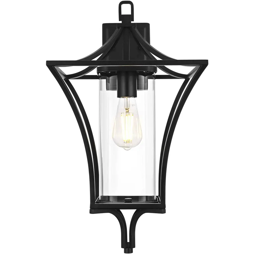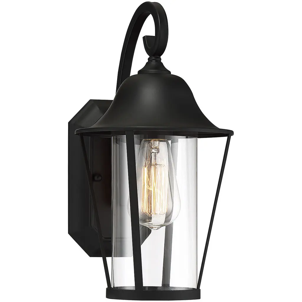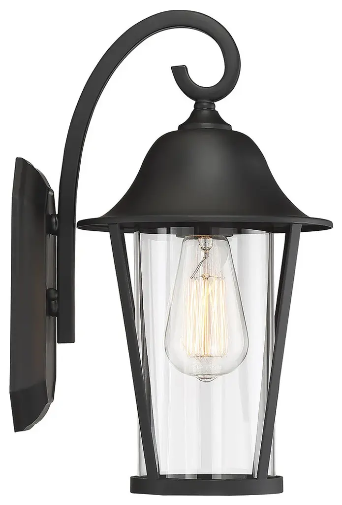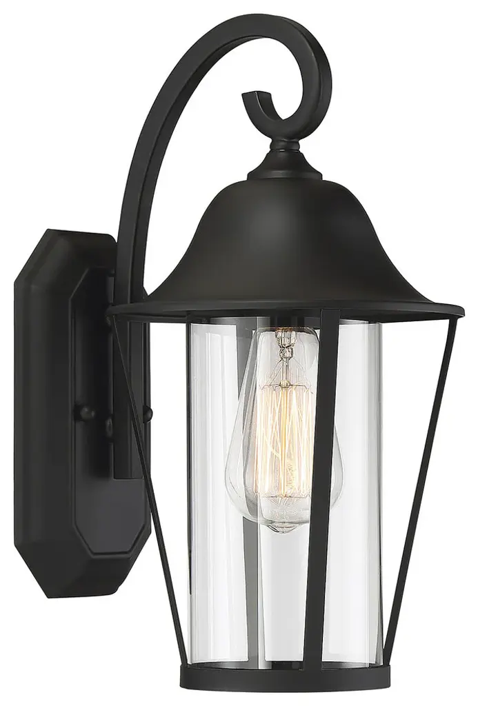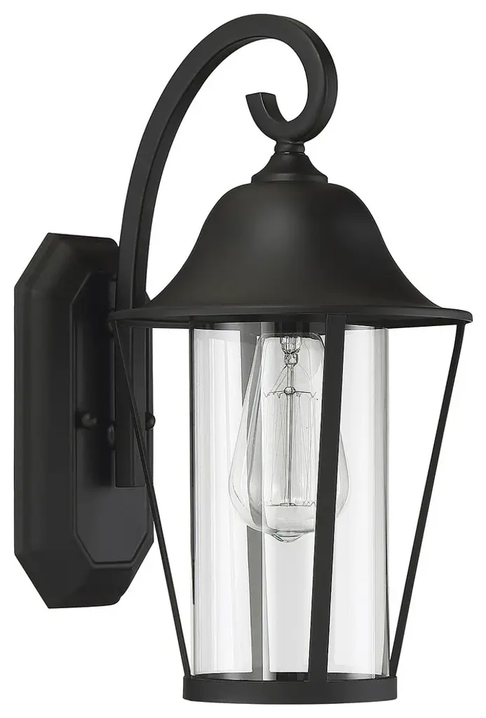 Brighten your exterior with this stylish wall lantern by Savoy House.Number of bulbs: 1Bulb not includedUL listed: YesWattage: 60HardwireFinish: BlackMaterials: Metal and glassDimensions: W 7.5" x D 7.5" x H 14"
