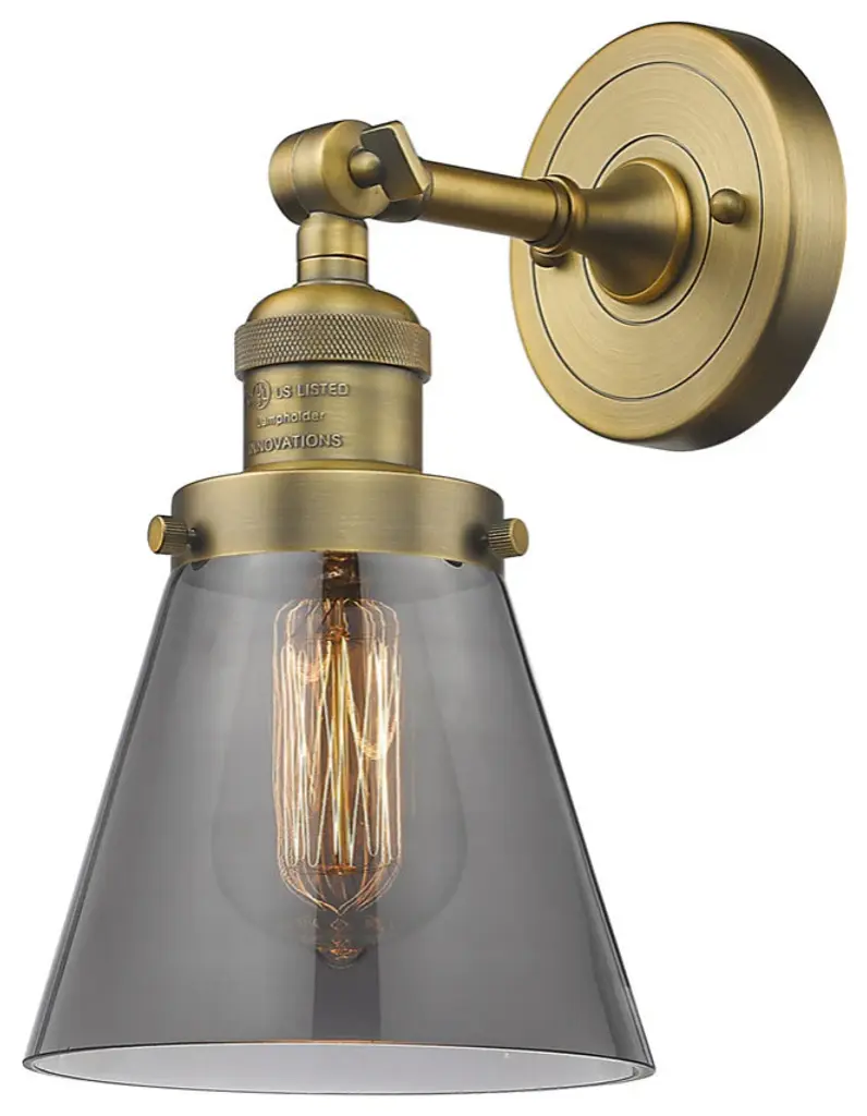 One of our largest and original collections, the Franklin Restoration is made up of a vast selection of heavy metal finishes and a large array of metal and glass shades that bring a touch of industrial into your home.Features:Solid brass 180 degree adjustable swivel with internal teeth that lock in at 5 degree intervals with engraved cast cupFixture can be hung with bulb facing up or down as a wall mount or facing down as a ceiling mount4.5 inch 2mm heavy cast backplateDistance from outlet opening to top of fixture 2.25 inchesRated for 100 watt maximumUL/CUL Damp RatedCompatible with Incandescent, LED, Fluorescent and Halogen bulbsNumber of Bulbs: 1Bulb Wattage: 100Bulb Type: IncandescentBulb Included: NoVoltage: 120Finish: Antique Brass Finish Shade Finish: Plated Smoke Shade