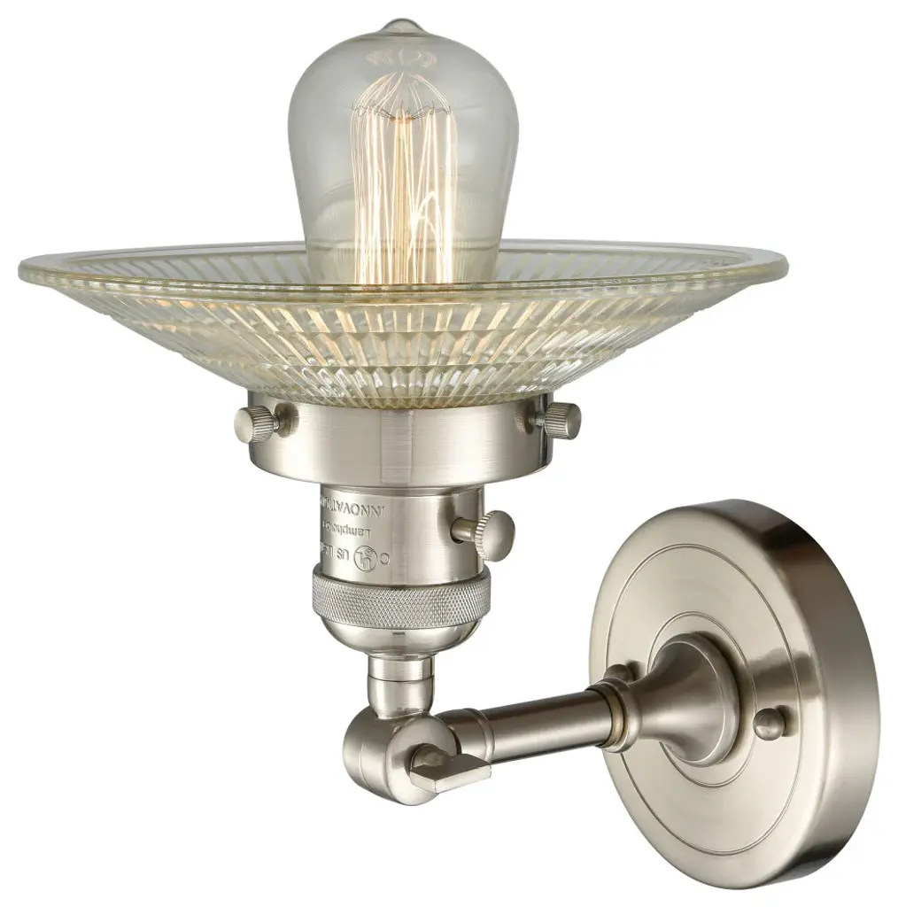 One of our largest and original collections, the Franklin Restoration is made up of a vast selection of heavy metal finishes and a large array of metal and glass shades that bring a touch of industrial into your home.Features:Solid brass 180 degree adjustable swivel with internal teeth that lock in at 5 degree intervals with engraved cast cup3 Way (High-Low-Off) switch included on socketFixture can be hung with bulb facing up or down as a wall mount or facing down as a ceiling mount4.5 inch 2mm heavy cast backplateDistance from outlet opening to top of fixture 2.25 inchesRated for 100 watt maximumUL/CUL Damp RatedCompatible with Incandescent, LED, Fluorescent and Halogen bulbsNumber of Bulbs: 1Bulb Wattage: 100Bulb Type: IncandescentBulb Included: NoVoltage: 120Finish: Brushed Satin Nickel Finish Shade Finish: Clear Halophane Shade