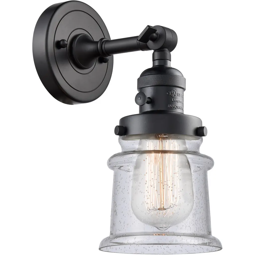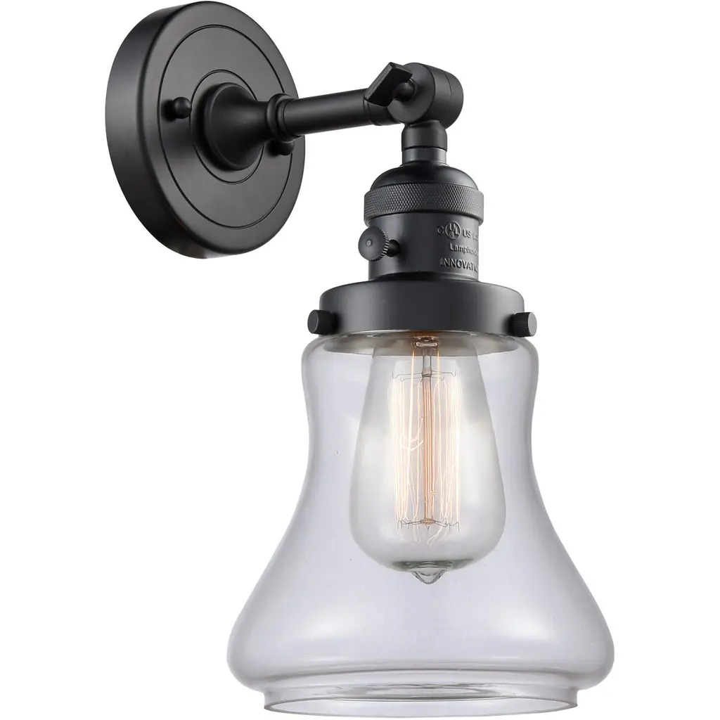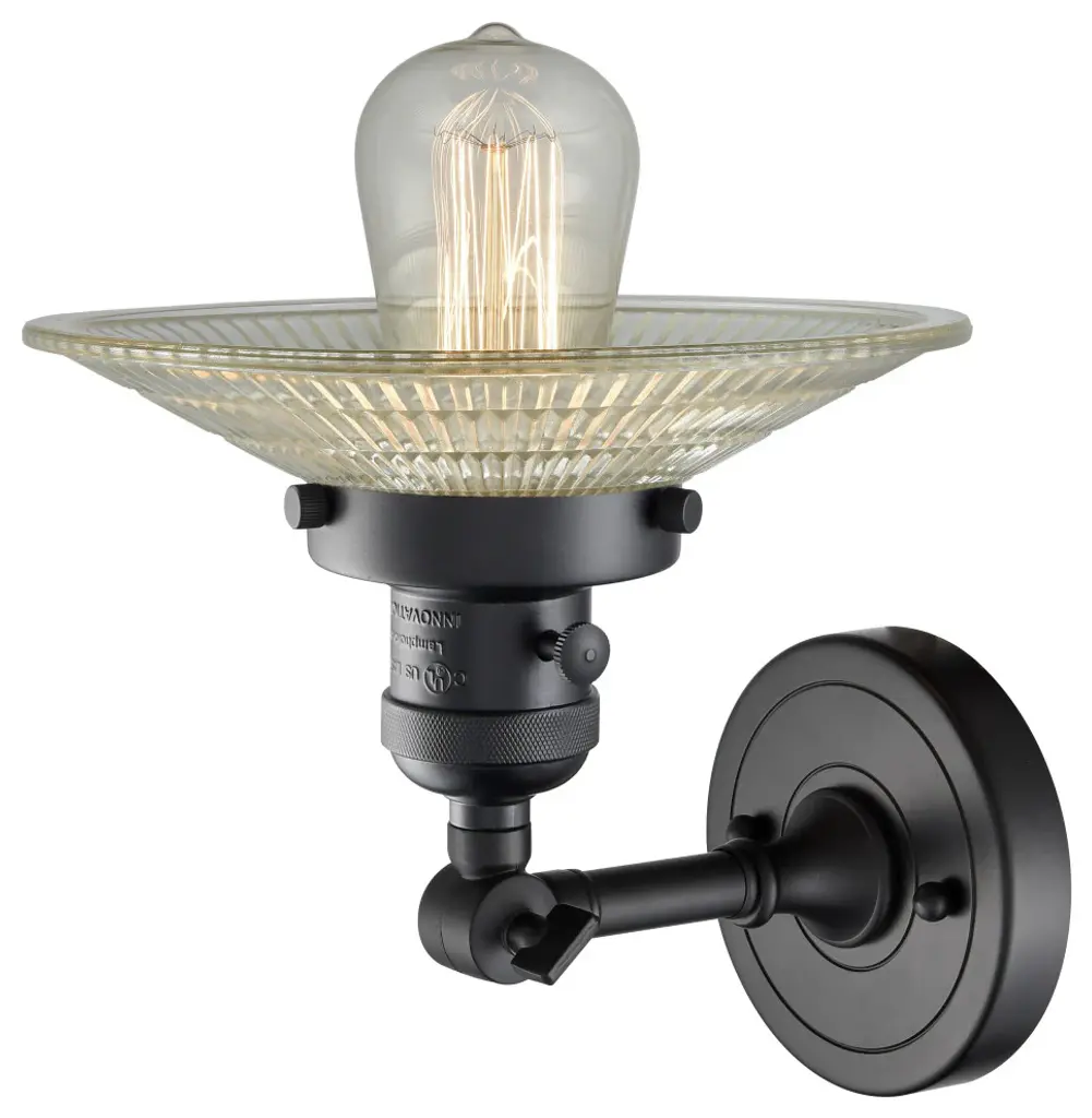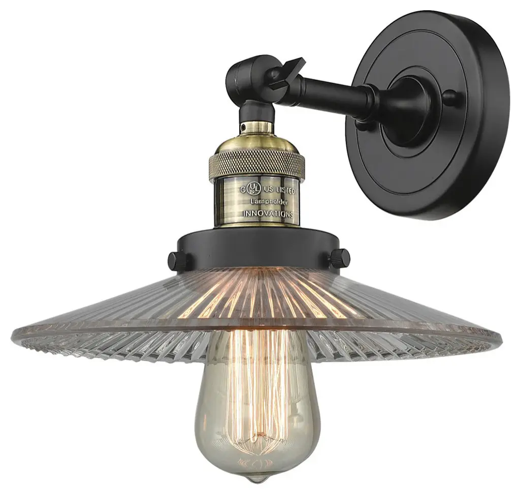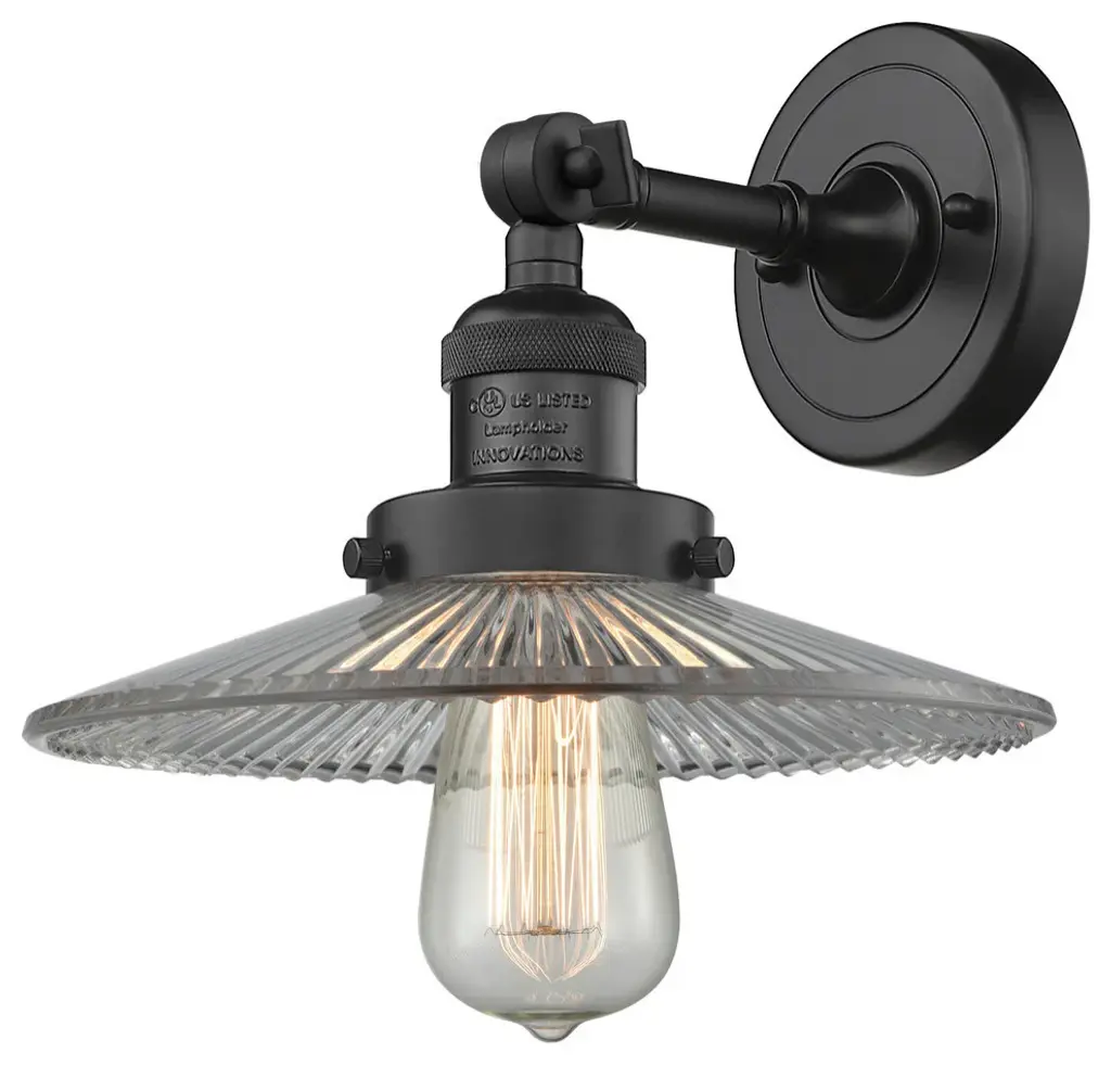 One of our largest and original collections, the Franklin Restoration is made up of a vast selection of heavy metal finishes and a large array of metal and glass shades that bring a touch of industrial into your home.Features:Solid brass 180 degree adjustable swivel with internal teeth that lock in at 5 degree intervals with engraved cast cup3 Way (High-Low-Off) switch included on socketFixture can be hung with bulb facing up or down as a wall mount or facing down as a ceiling mount4.5 inch 2mm heavy cast backplateDistance from outlet opening to top of fixture 2.25 inchesRated for 100 watt maximumUL/CUL Damp RatedCompatible with Incandescent, LED, Fluorescent and Halogen bulbsNumber of Bulbs: 1Bulb Wattage: 100Bulb Type: IncandescentBulb Included: NoVoltage: 120Finish: Matte Black Finish Shade Finish: Clear Halophane Shade