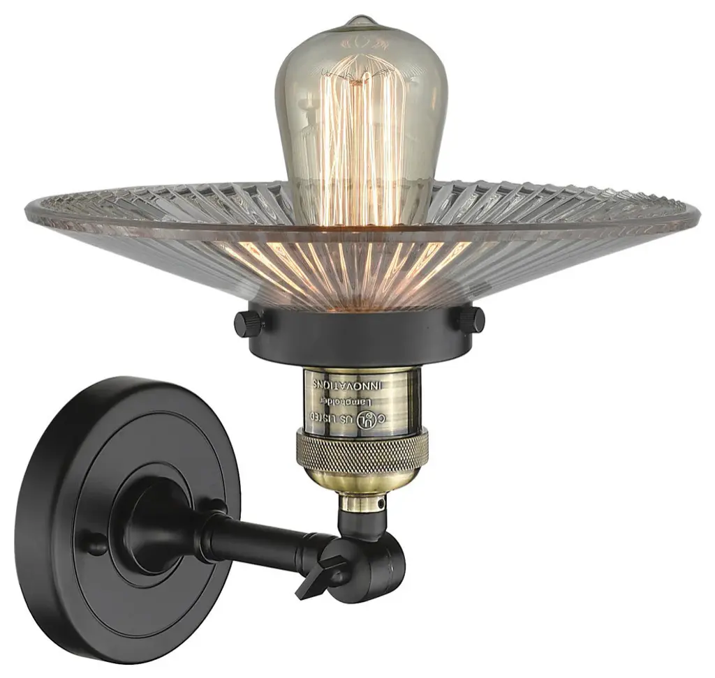 One of our largest and original collections, the Franklin Restoration is made up of a vast selection of heavy metal finishes and a large array of metal and glass shades that bring a touch of industrial into your home.Features:Solid brass 180 degree adjustable swivel with internal teeth that lock in at 5 degree intervals with engraved cast cupFixture can be hung with bulbs facing up or down as a wall mount or facing down as a ceiling mount4.5 inch 2mm heavy cast backplateDistance from outlet opening to top of fixture 2.25 inchesRated for 100 watt maximumUL/CUL Damp RatedCompatible with Incandescent, LED, Fluorescent and Halogen bulbsNumber of Bulbs: 1Bulb Wattage: 3.5Bulb Type: LEDBulb Included: IncludedVoltage: 120Finish: Black Antique Brass Finish Shade Finish: Clear Halophane Shade