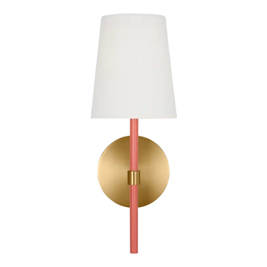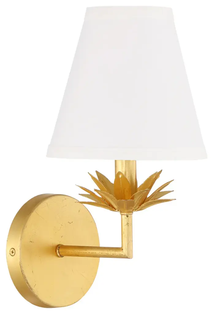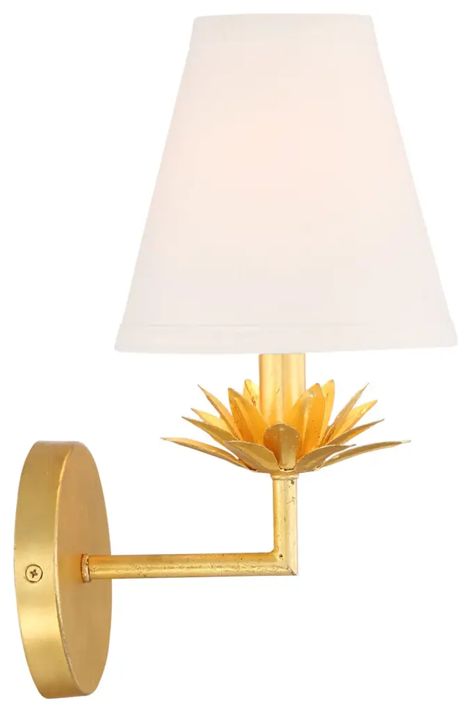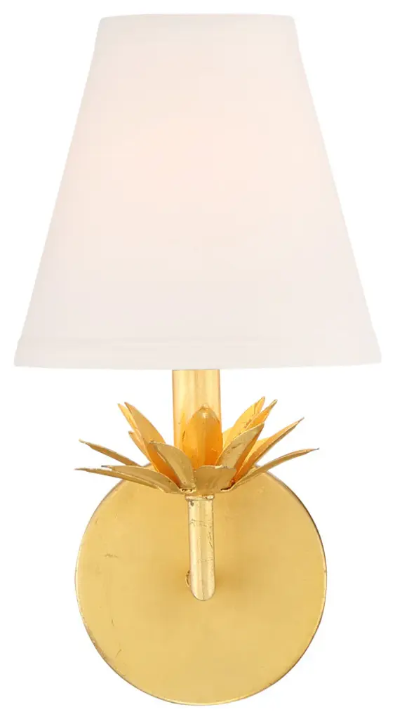 This 1-light wall sconce features a simply sleek look with an angled arm and a floral bobeche beneath a white linen shade for a touch of organic beauty. The True Gold finish adds a dose of glamour with a rustic edge. This sconce looks great when used solo or in groupings! 12" height, 6" width, extends 7.25" from the wall. Max 60 watt bulb, candelabra size C11 bulb recommended. LED bulb compatible. Damp area rated.