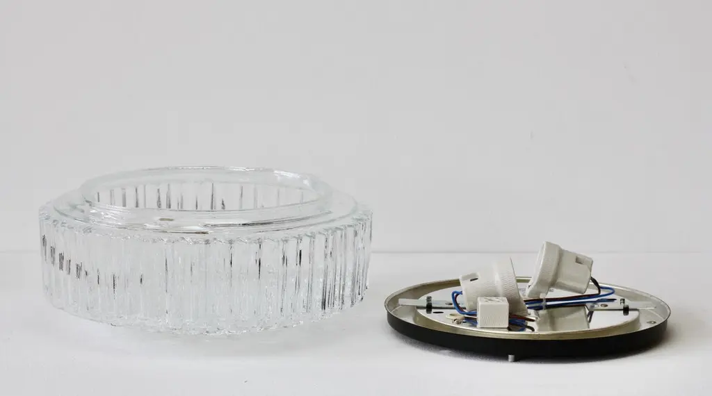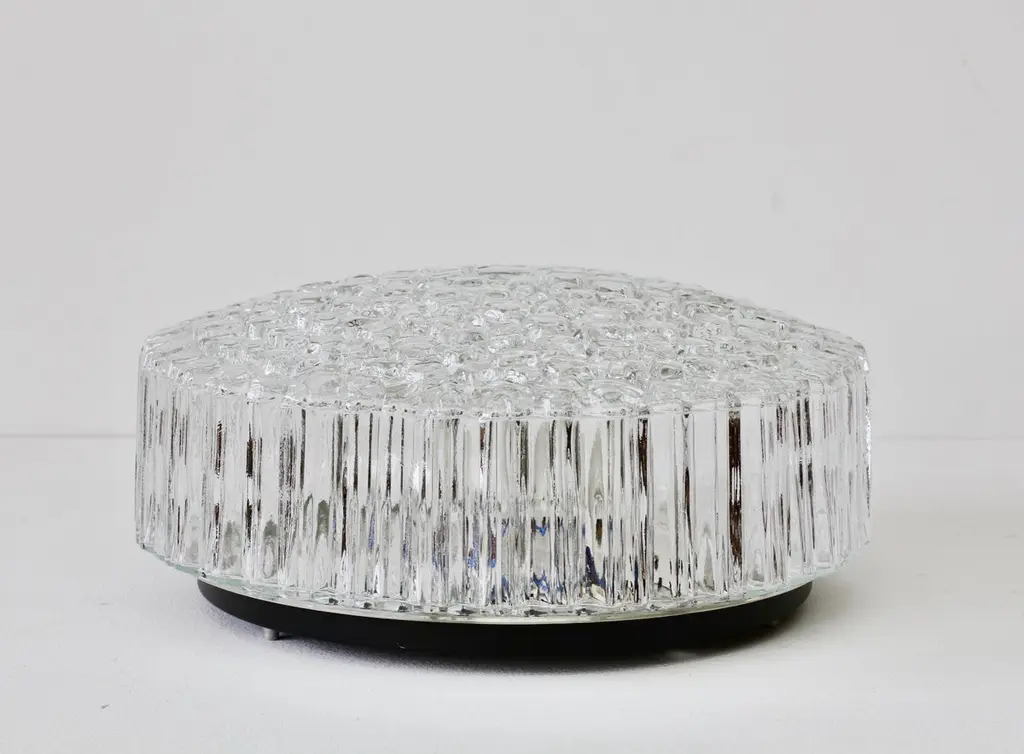 One of a pair of 'new old stock' vintage midcentury flushmount light fixtures / sconces by Glashütte Limburg, circa 1970s. Featuring a wonderful mouth blown, molded and textured clear glass shade resembling ice crystals, this midcentury vintage lamp illuminates beautifully, casting a warm light over a ceiling or wall.Two available and priced individually - can be purchased as a pair or singularly.Each fixture requires two E27 lightbulb (60 Watt max.) Glashütte Limburg model number.