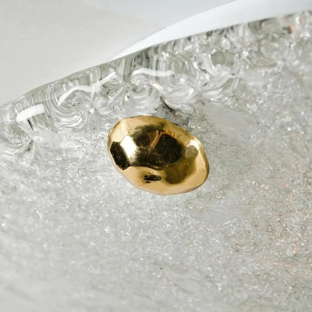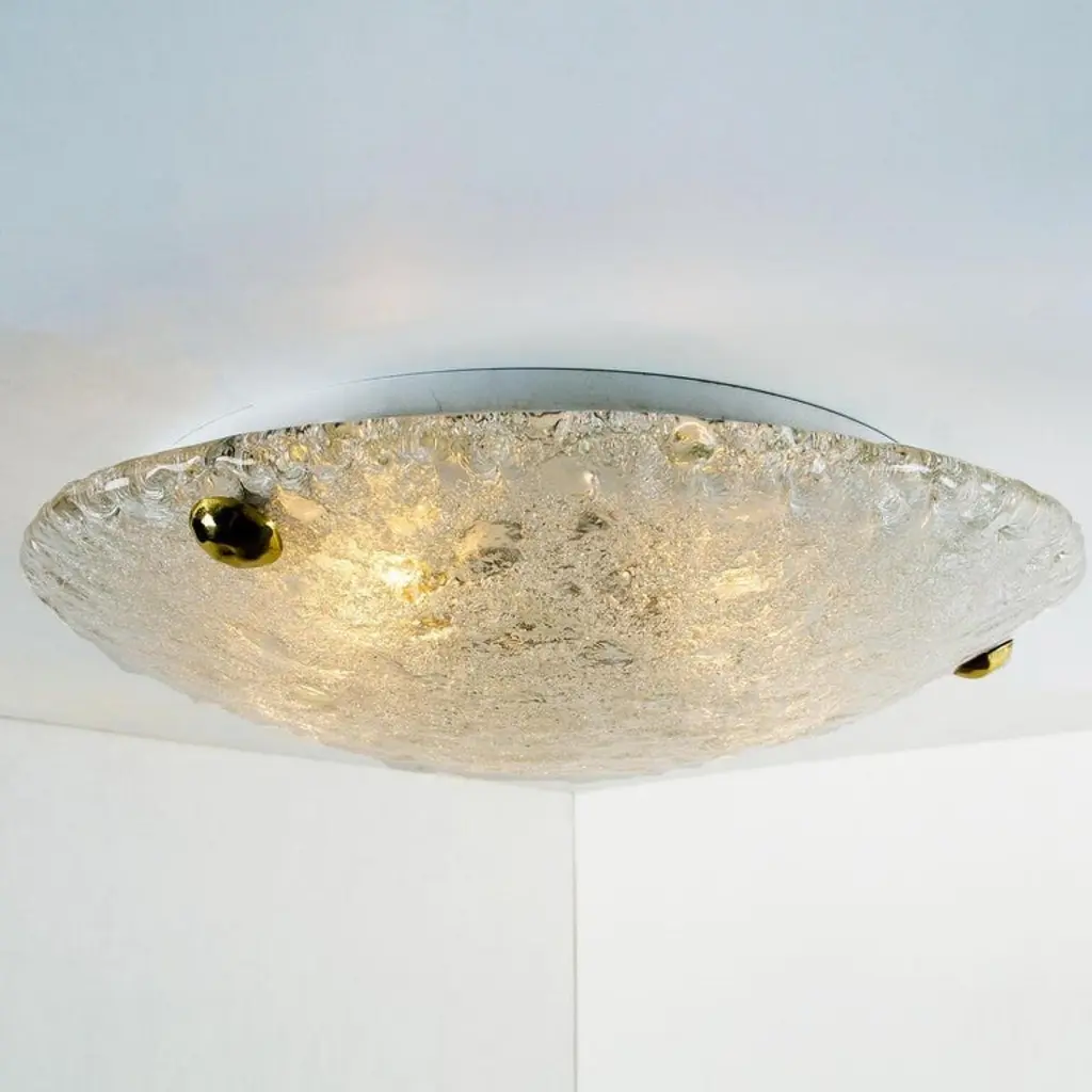 1 of the 2 high quality modern textured ice glass flush mounts by Hillebrand, circa 1965.This flush mounts are featuring a huge round hand blown glass dish. Beautiful craftsmanship.Can also work for impressive wall lights.Please notice theprice is for 1 piece. 2 pieces available in 2X 15.7" 50 cmThe dish is handmade of 'Frit' glass. Many of tiny glass hards which are molded into the glass during its manufacture giving the piece a heavy ice appearance which refracts the light, filling a room with a soft, warm glow.With polished white lacquered back plate and mounting hard ware. Held in place by three large brass screws. The price is for one light fixture. In good condition. Cleaned well-wired and ready to use. The light requires three E27 screw fit light bulbs (40Watt max. per bulb).