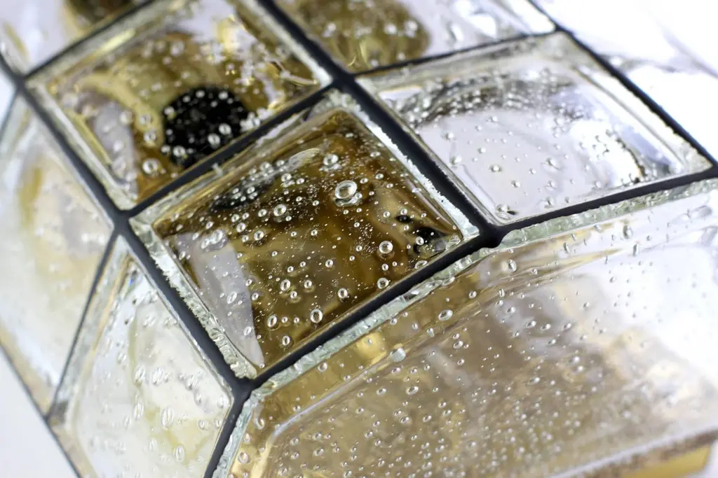 One of a set of four minimal, geometric and simply shaped flushmount wall light / sconce by Glashütte Limburg, Germany, circa 1965. These midcentury vintage lights feature handmade, mouth blown bubble glass which bulges slightly out of it's black "Iron" coated frame giving the lights a Minimalist, simple and pleasing Contemporary Art Deco Lantern style form.These lights are some of the hardest to find by Limburg, especially these double socket wall lights.Newly re-wired, each light takes two E14 screw fit bulb (max.100W.)Price individually. (Four available).