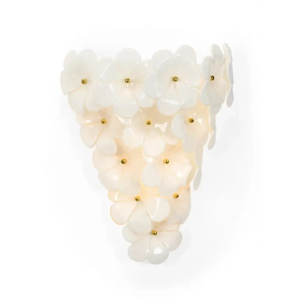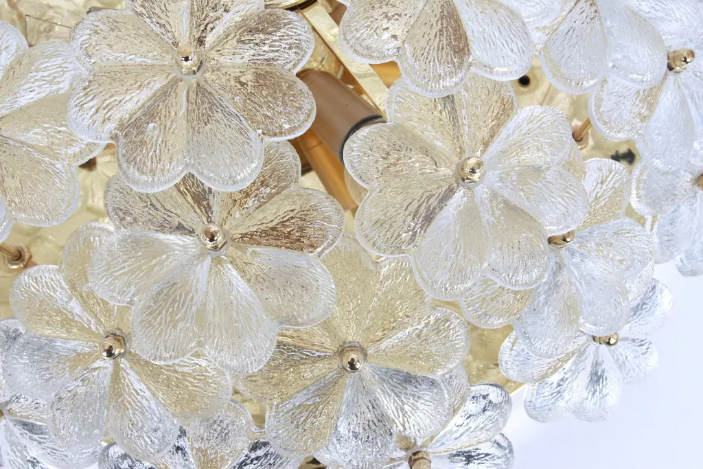 Midcentury flushmount light or sconce with 42 Murano glass flowers over a polished brass base, made by Ernst Palme in Germany, 1970s.High quality and in very good condition. Cleaned, well-wired and ready to use. The fixture requires 6 x E14 standard bulbs with 40W max each and compatible with the US/UK/ etc. standards.4 Items are available.The listed price is for one item.