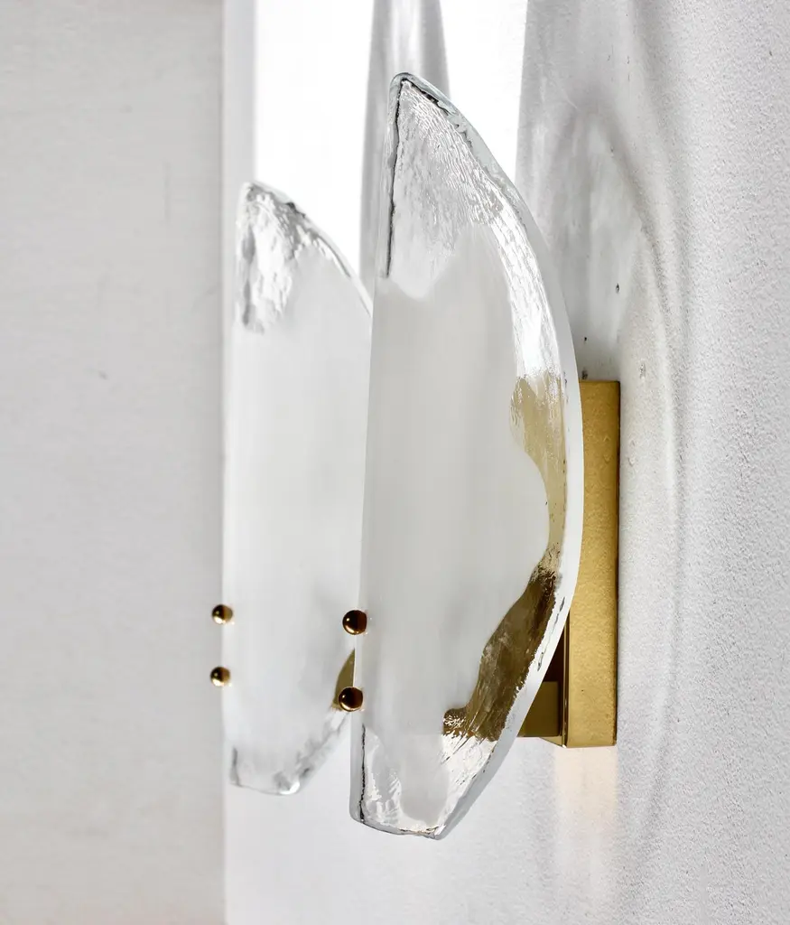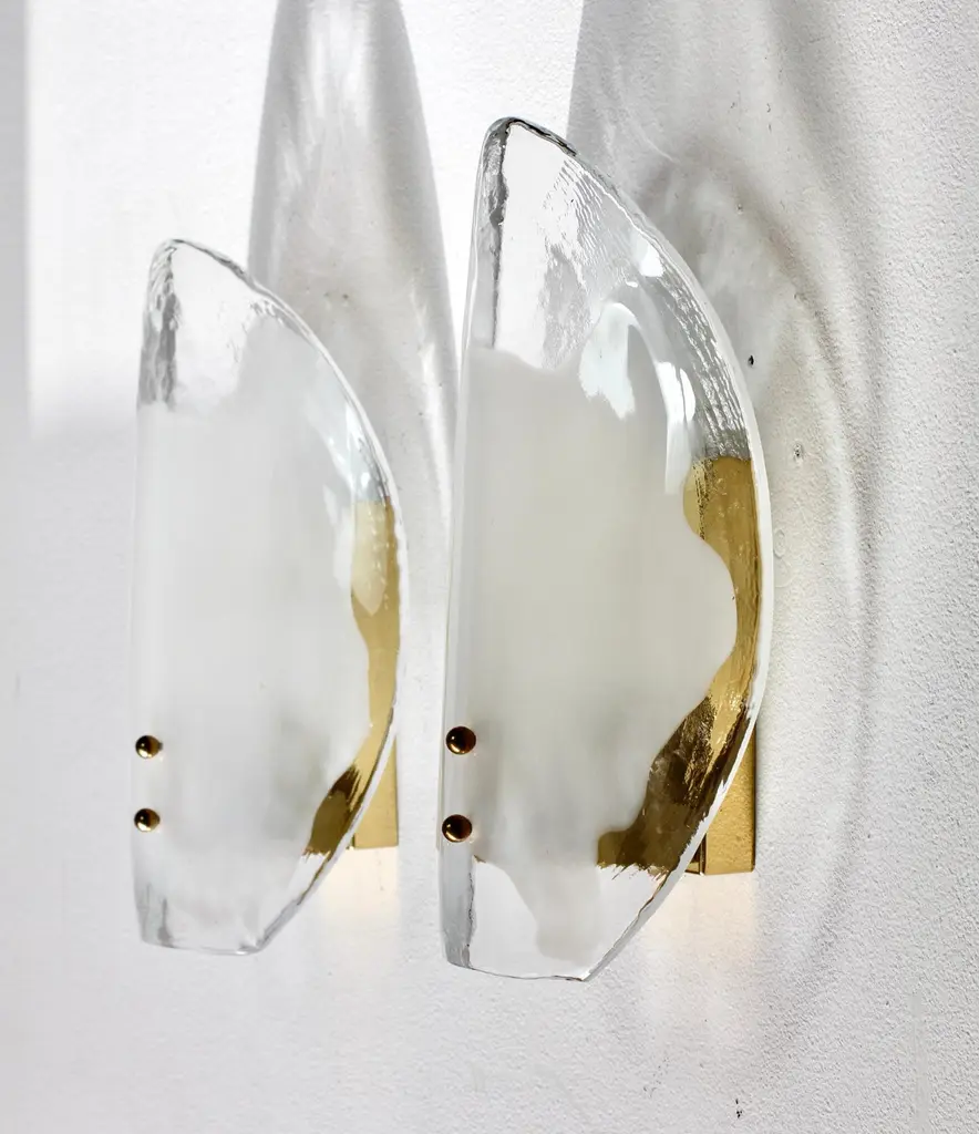 One of four pairs of Vintage Mid-Century Modern rare, organic brass, white and clear Murano glass double socketed wall lamps, lights or sconces by Austrian lighting manufacturer Kalmar, circa 1970s. Featuring two folded, curved 'flower petal' shaped glass elements / shades, made by Italian Murano glass maker AV Mazzega and designed by Carlo Nason.Classic 1970s design - with it's wonderful two toned glass. Perfect as a pair of vanity lamps, in the entrance / hallway or as bedroom lighting.Each light requires two E14 lightbulb (40 Watt max.). Re-wired for 220 volts (EU standards) Eight pairs in total - (four pairs sold already - only four pairs left) - priced and sold as pairs. Kalmar Franken KG.