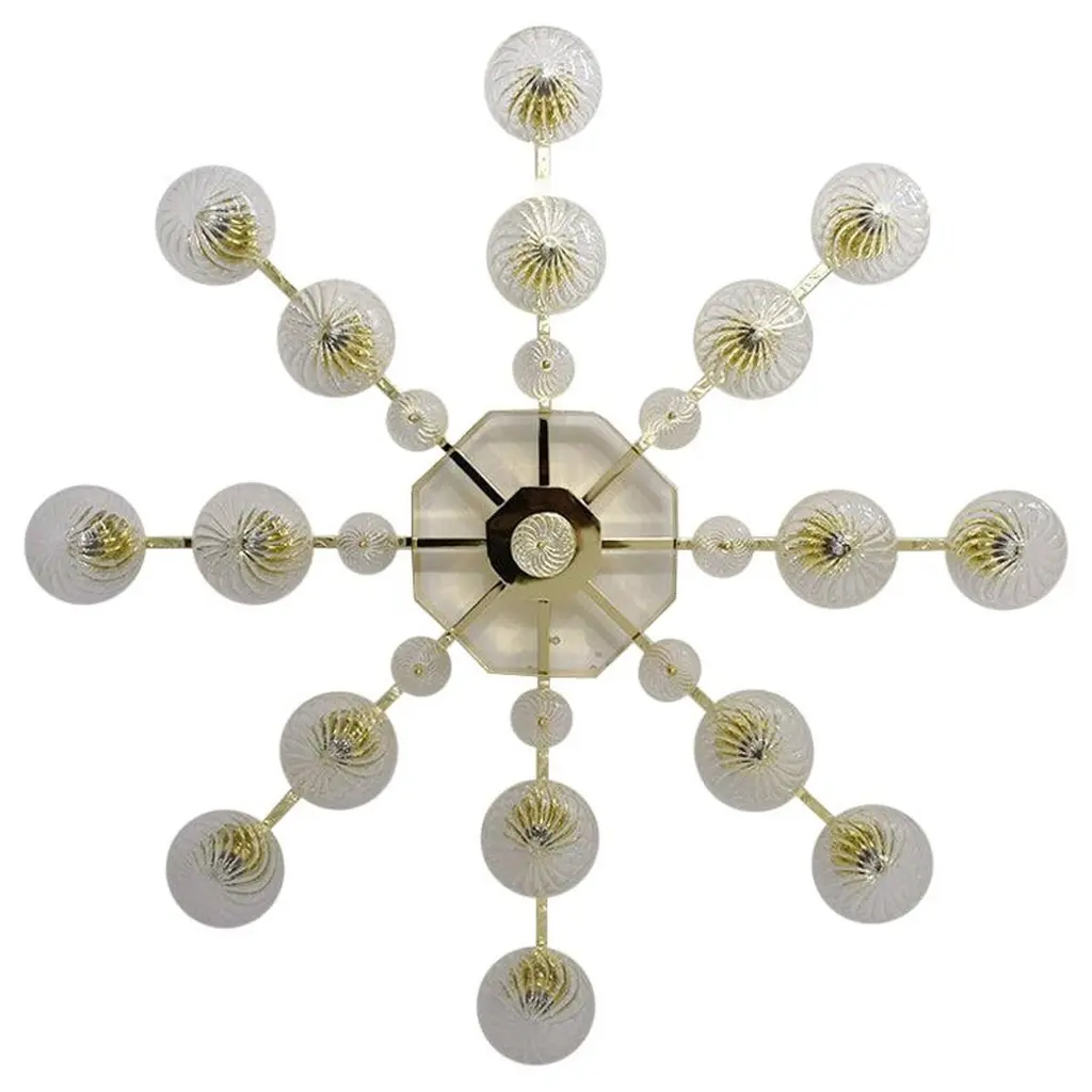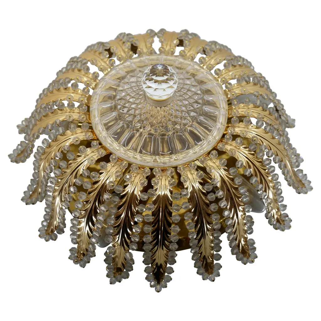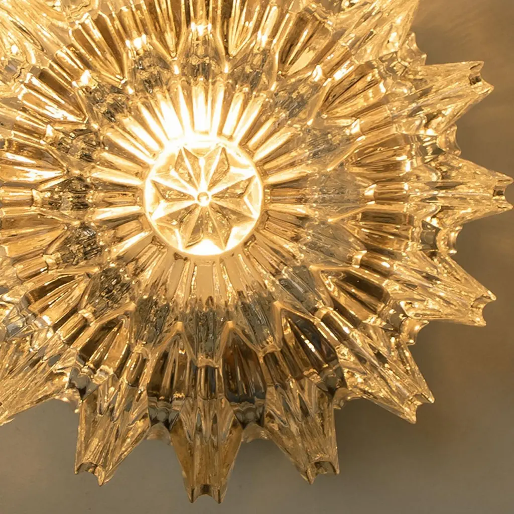 1 of 4 Putzler wall lights in sculptural glass on a brass frame, circa 1970s, Germany. Statement pieces. A clear design, with modern materials and special textures. With gold inclusions in the lines of the backside of the glass shade. This modernist design is focused on the textured round glass, when illuminated the base glistens gold and casts interesting reflections. The glass is shaped in a beautiful round, sun-like shape, creating a bright and ambient look.These wall lights would complement a range of decor schemes. The wall lights could also be installed as flush ceiling lights.Dimensions:Diameter: 6.69" (17 cm)Depth: 3.14" (8 cm)Please notice the price is for the one light, we have 4 available.Cleaned and re-wired, in full working order and ready to use. The chrome frame is in very good condition. The wall lights can be disassembled and the crystal shades individually wrapped for easy transport. Each light takes one big screw standard (E14) light bulb up to 100 Watts.