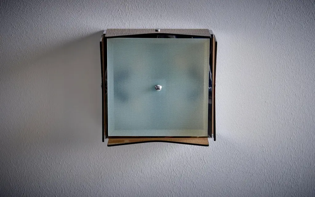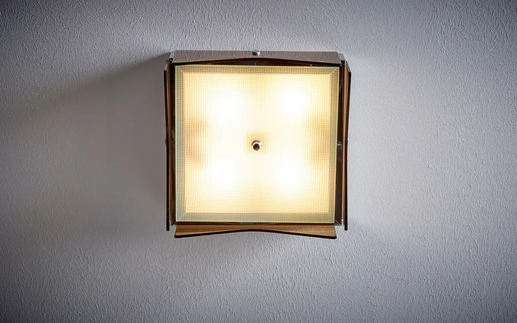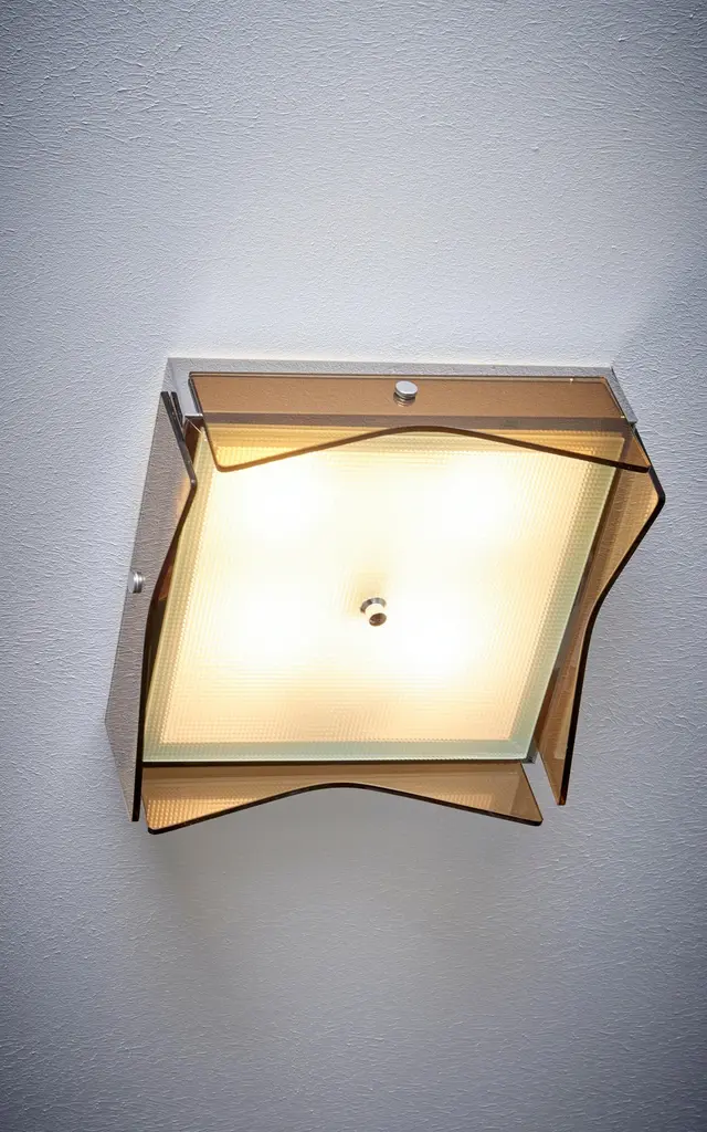 1960s Design Italian Wall Lamp nos in tinted brown glass. Price is per piece. We have two more listings with a flush mount of this type (one with a slightly different shape in tinted brown glass, one with clear glass).