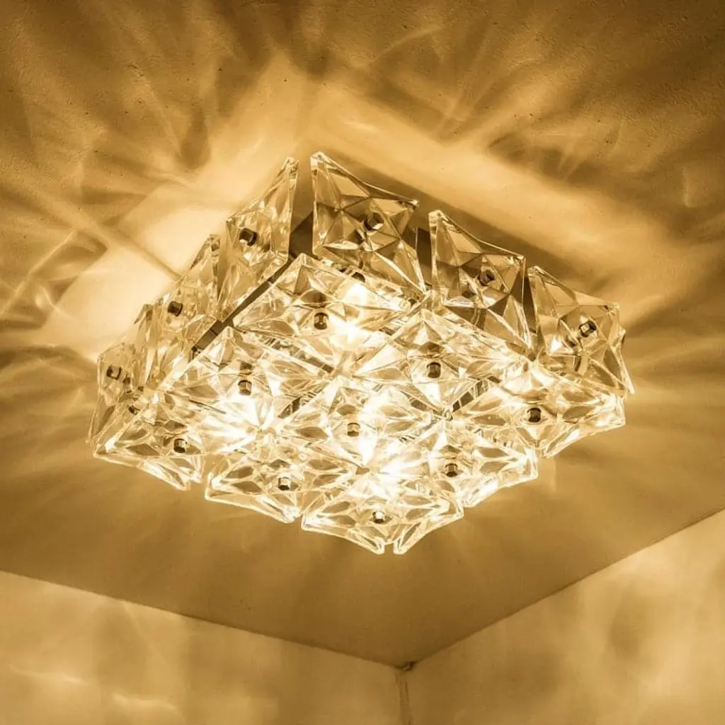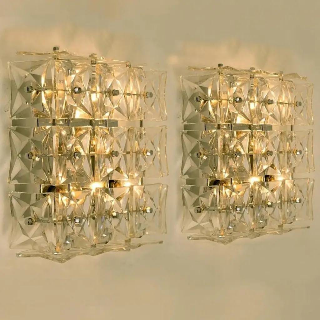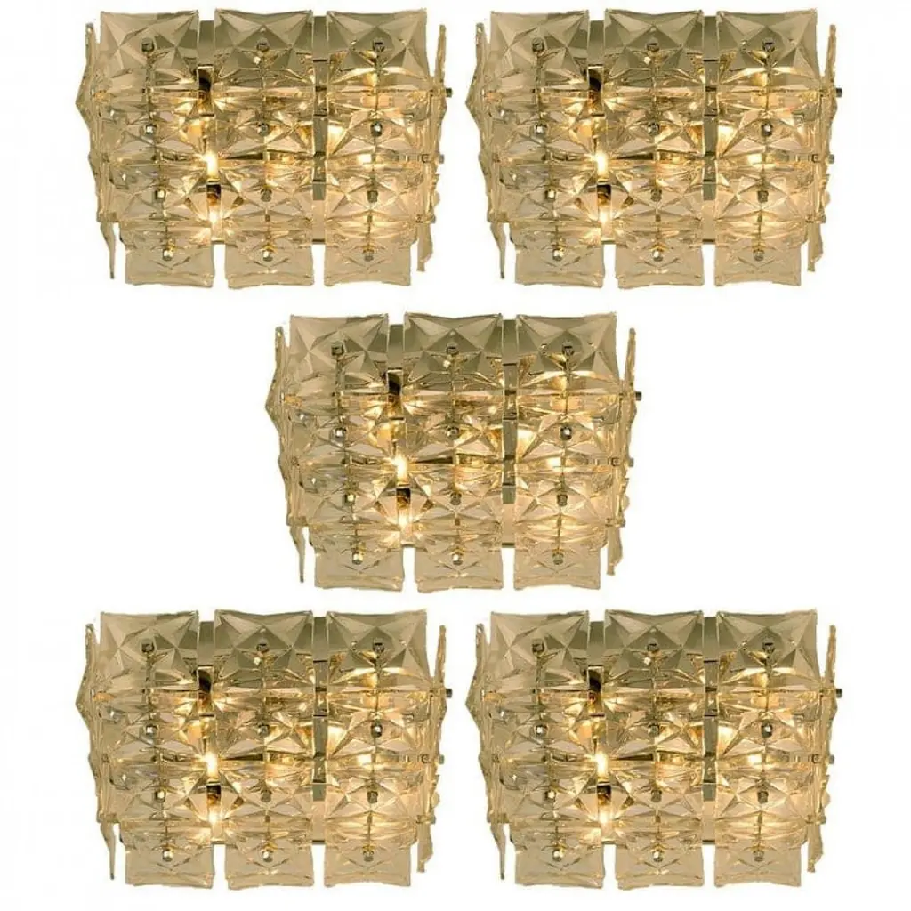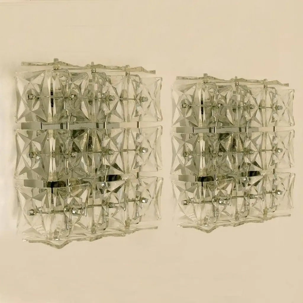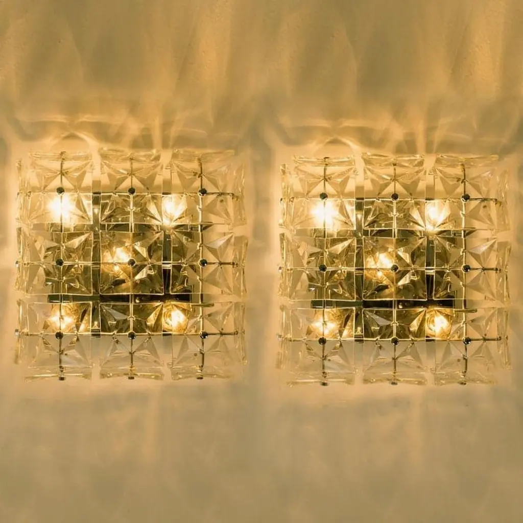 One of five square light fixtures by Kinkeldey, Germany, manufactured in midcentury, circa 1970 (late 1960s-early 1970s). A nickel frame holds 21 large square cut crystal glasses. They can be used as sconces or ceiling lights.The price is per sconce. They will be sold singly or as pair or as a set.Each fixture has five sockets for small base Edison LED or filament bulbs (max. 40W per bulb).
