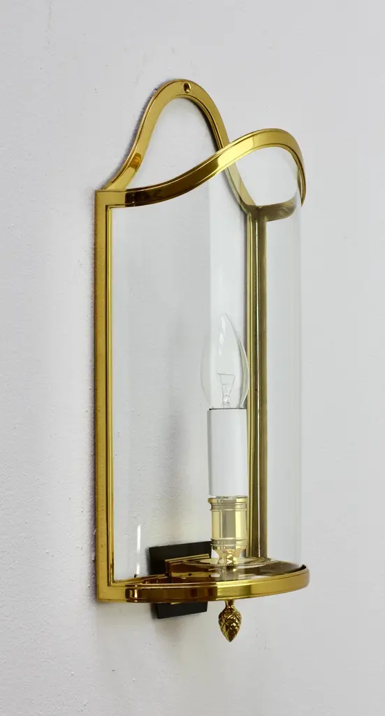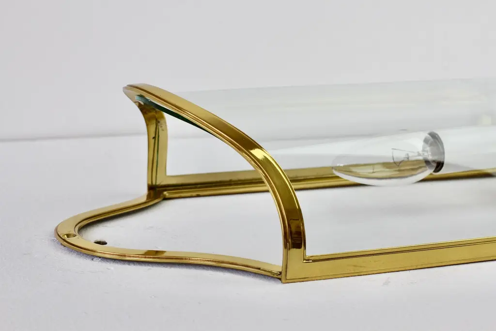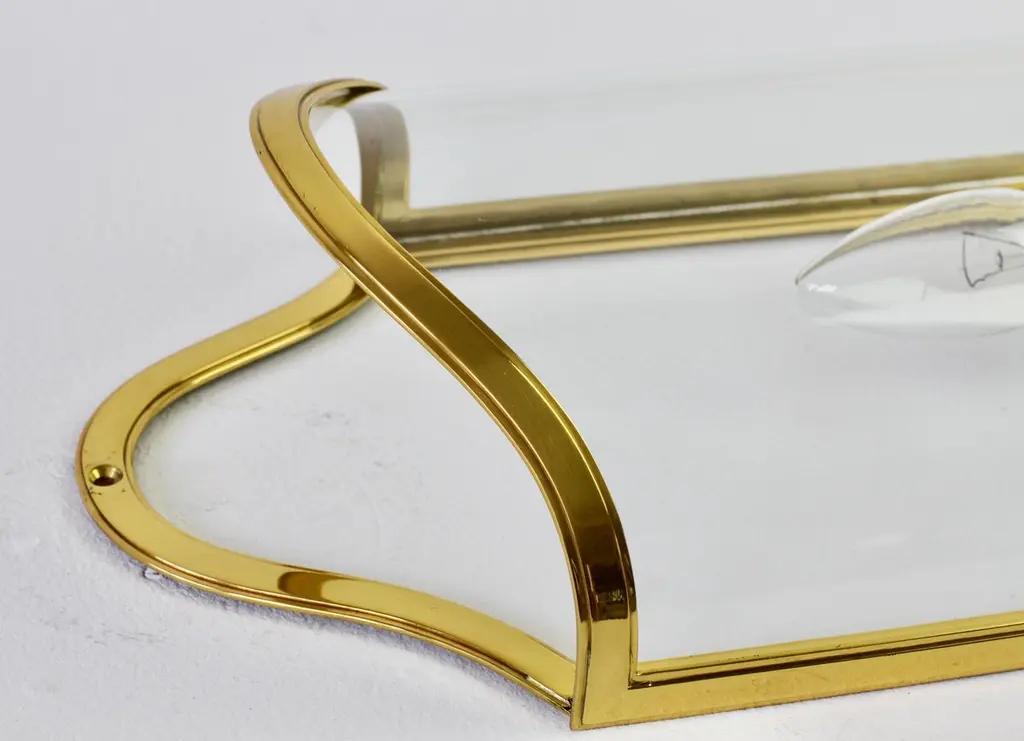 One of a set of five stunning elegant and large scale vintage mid-century vintage wall lights, lamps or sconces made of polished brass with original curved and cut glass scroll shaped shades by the German united ateliers Vereinigten Werkstätten München (Munich), circa 1970s. Beautiful design and incredibly good craftsmanship, equal to French makers Maison Charles or Maison Jansen.Each fixture requires a bulb with E14 socket (60 Watts max.) LED bulbs can also be used.Five available - priced and sold individually, in pairs or sets.