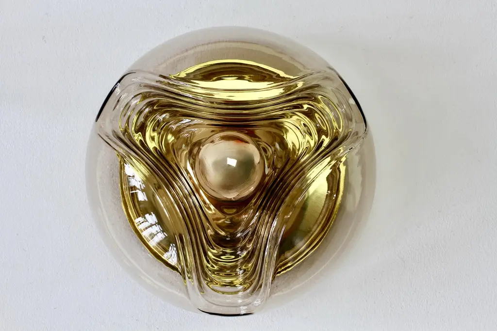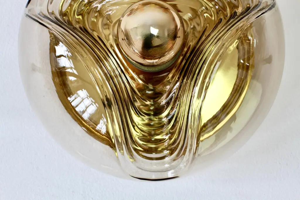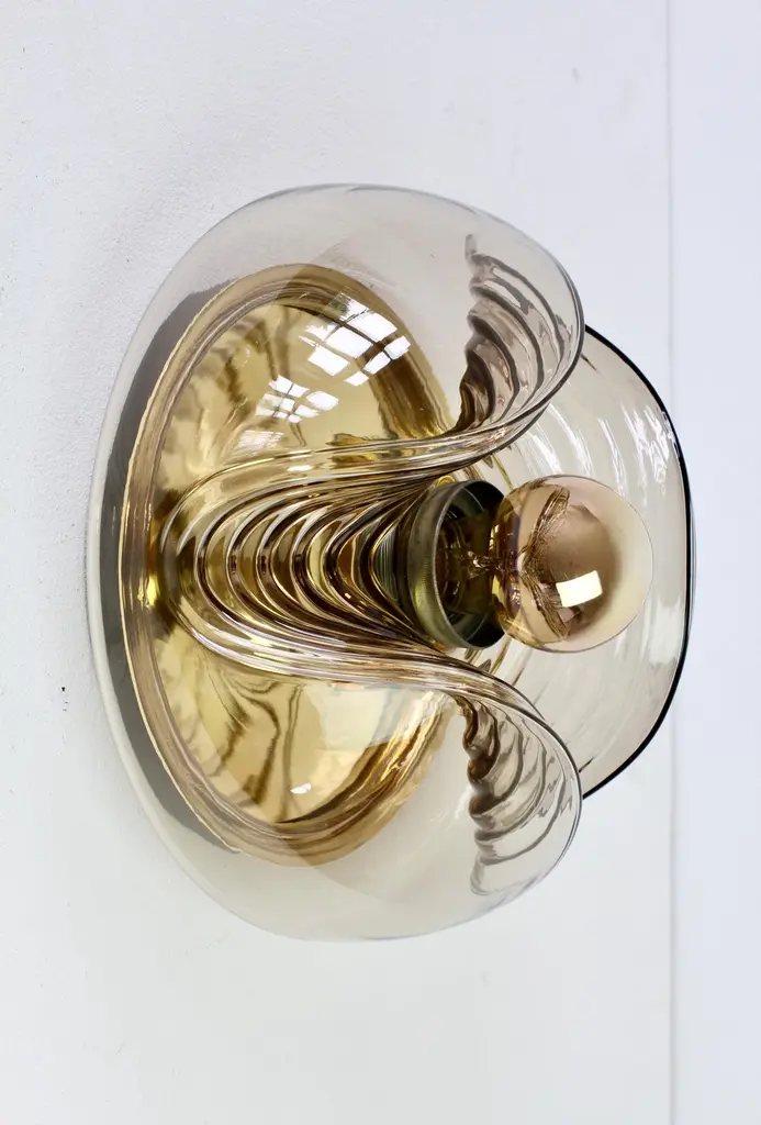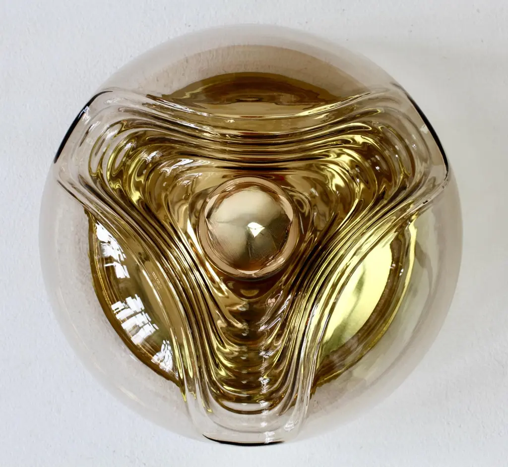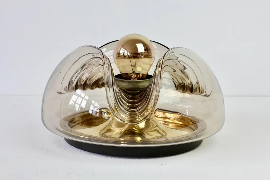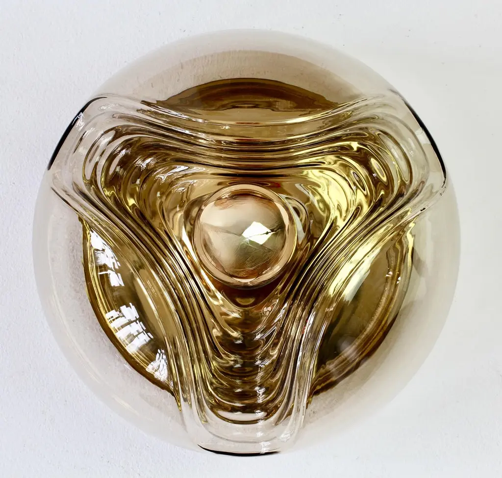 One of a large set of eight mid-century flush mount ceiling or wall lights / sconces by Peill & Putzler in the 1970s. This is an absolutely Classic piece of design, featuring a smoked coloured (colored) glass globe shade with a waved/ribbed molded bubble form, casting a beautiful rippled light across a wall or ceiling.With its biomorphic, futuristic shape which echoes that of the Space Age race of that era the light looks great paired with any items made of acrylic or items with bold "Space Age" forms.Newly re-wired each light requires a single E27 lightbulb (100 Watt max.).Eight available - priced and sold individually - they can be purchased either singularly, in pairs or as a set of three or more (please contact us for a shipping quote if you wish to purchase more than a single lamp).We also have these in different sizes, with clear glass and chrome and as pendant lights - click on the 'see more from seller' banner to be taken to our storefront.