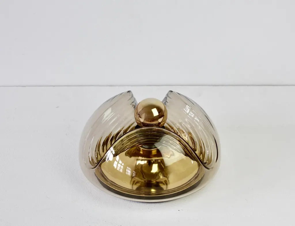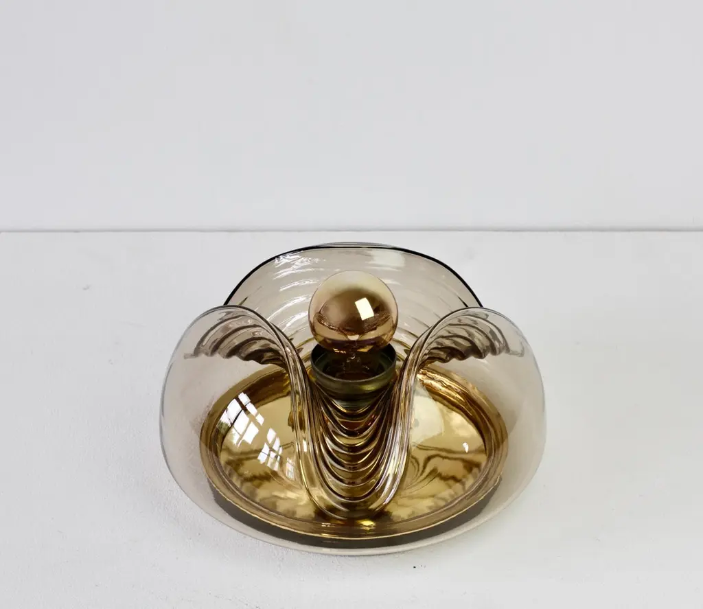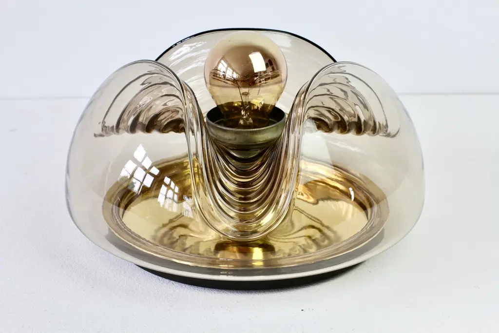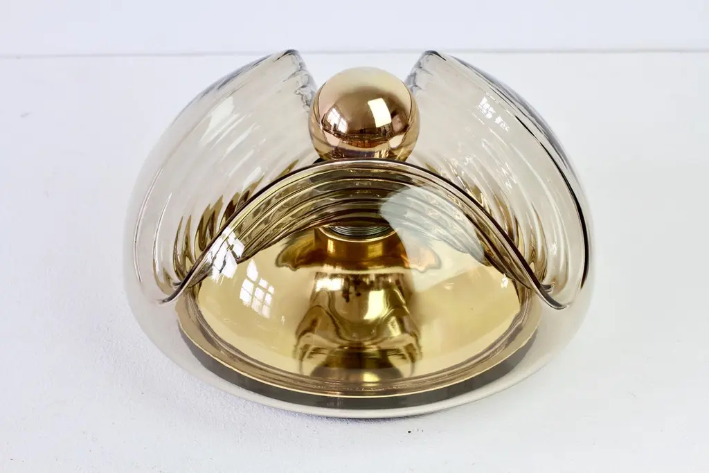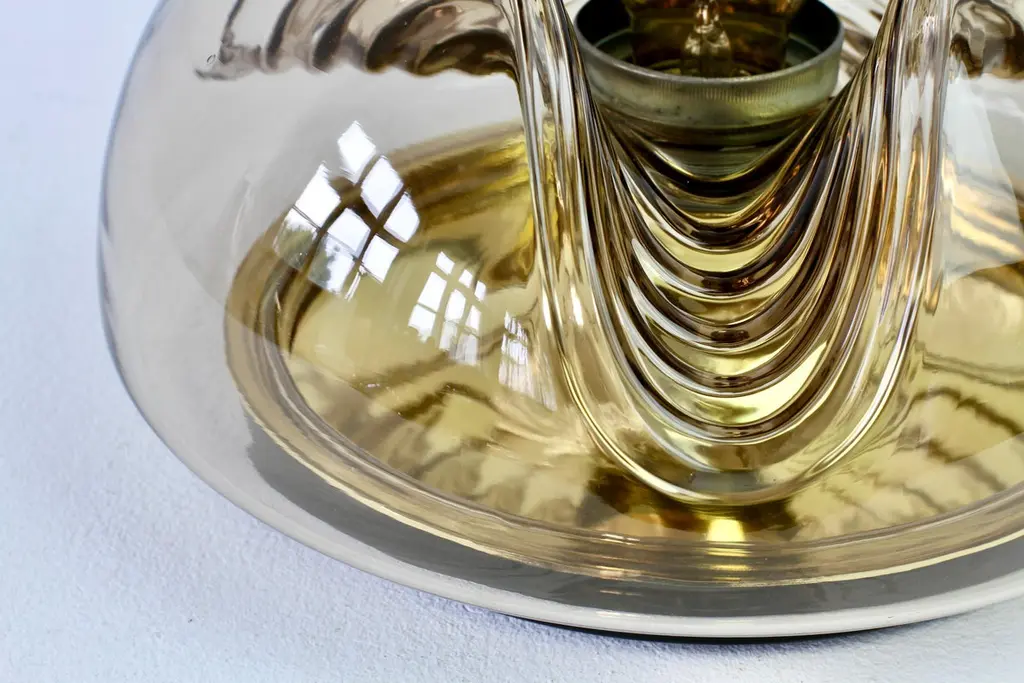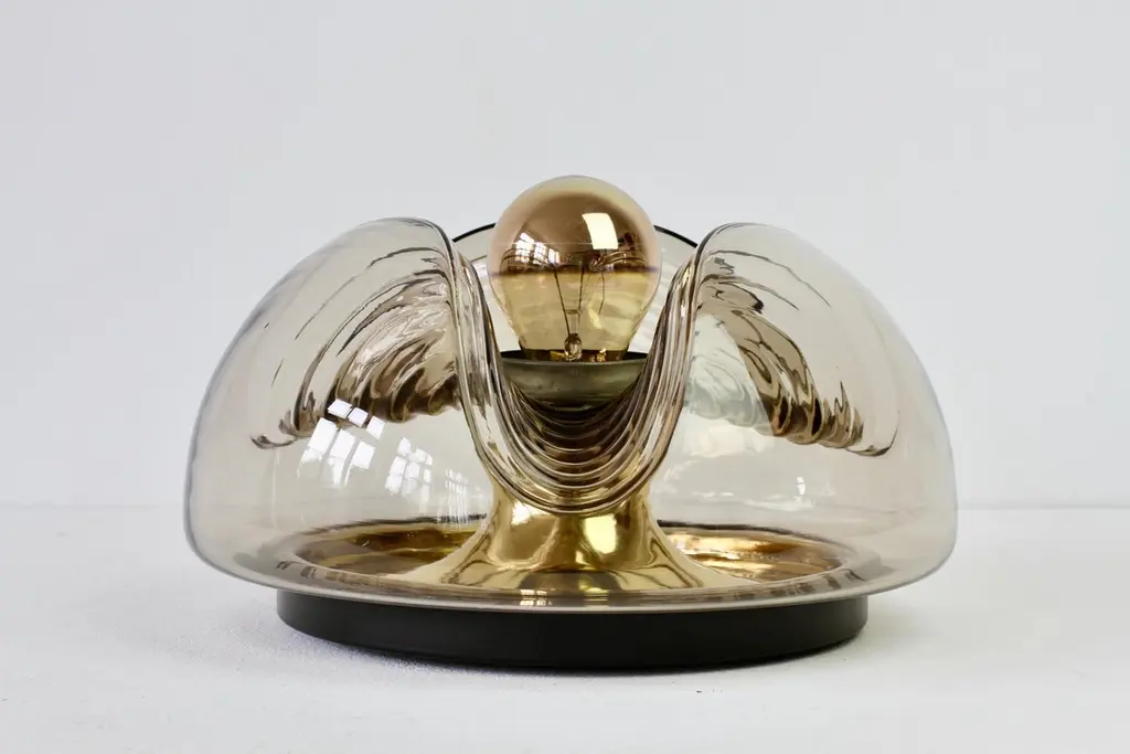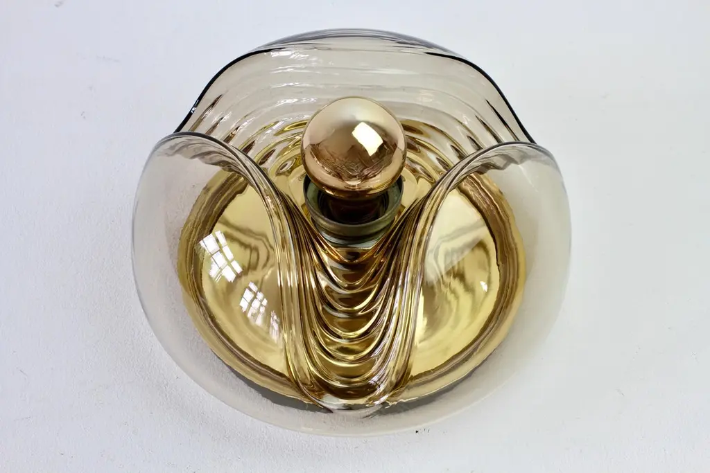 One of a large set of eight mid-century flush mount ceiling or wall lights / sconces by Peill & Putzler in the 1970s. This is an absolutely Classic piece of design, featuring a smoked coloured (colored) glass globe shade with a waved/ribbed molded bubble form, casting a beautiful rippled light across a wall or ceiling.With its biomorphic, futuristic shape which echoes that of the Space Age race of that era the light looks great paired with any items made of acrylic or items with bold "Space Age" forms.Newly re-wired each light requires a single E27 lightbulb (100 Watt max.).Eight available - priced and sold individually - they can be purchased either singularly, in pairs or as a set of three or more (please contact us for a shipping quote if you wish to purchase more than a single lamp).We also have these in different sizes, with clear glass and chrome and as pendant lights - click on the 'see more from seller' banner to be taken to our storefront.
