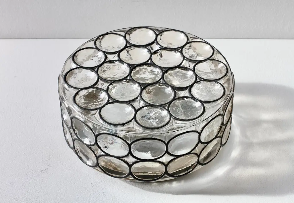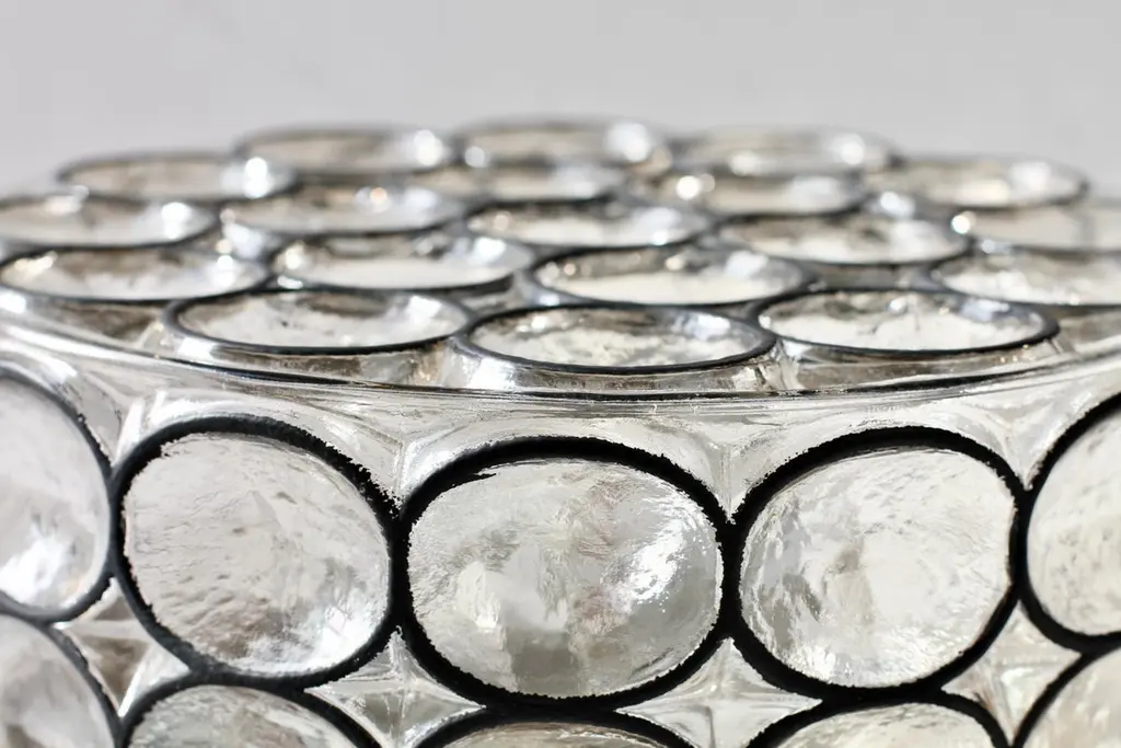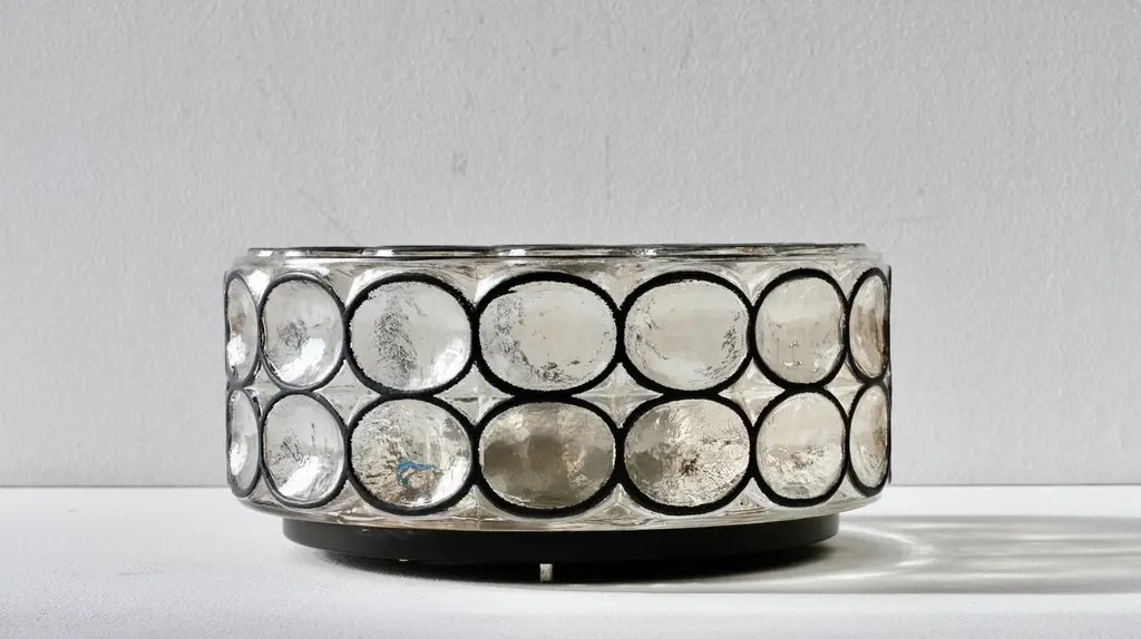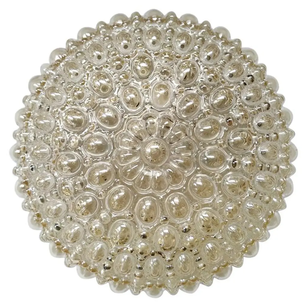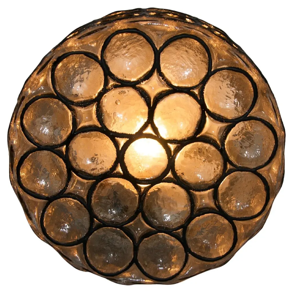 One of a pair of Mid-Century Modern vintage Glashütte Limburg, large double socketed circular iron and glass flush mount lights / sconces made in Germany, circa 1965. Featuring thick, heavy blown glass with concave round "Iron" rings which cast a wonderful light across a wall or ceiling. These were the largest model produced in this range and are particularly hard to come by..Newly rewired to EU standards (240 Volts) this light fixture requires a pair of lightbulbs 100 Watt E27 or E26 for US customers.Matching medium and smaller sizes are available in our 1stdibs store.
